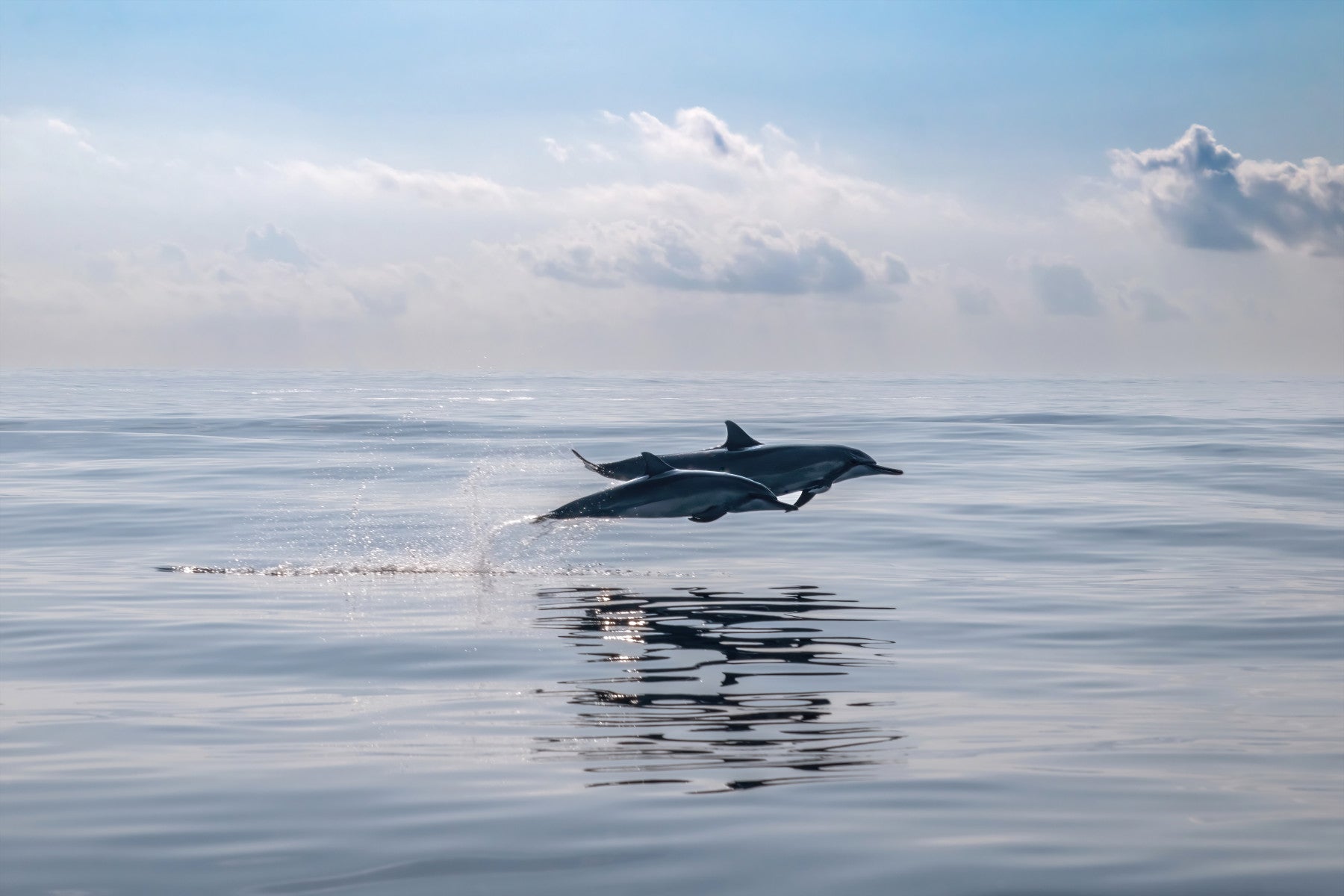 Experience the breathtaking freedom of the open ocean with "Dolphin's Leap". This stunning wallpaper captures a moment of pure joy as a pair of dolphins burst forth from the shimmering surface of the water. The cool, calming blues of the sea and sky create a serene and tranquil atmosphere, transporting you to a world of aquatic grace. Sunlight dances on the gentle waves, reflecting a mesmerizing pattern that adds depth and dimension to the image. The dynamic composition highlights the dolphins' powerful leap, showcasing their agility and playful nature. Let "Dolphin's Leap" bring a touch of the wild and untamed into your digital space, inspiring a sense of wonder and connection to the natural world. It's a reminder of the beauty and freedom that exists just beyond the horizon.