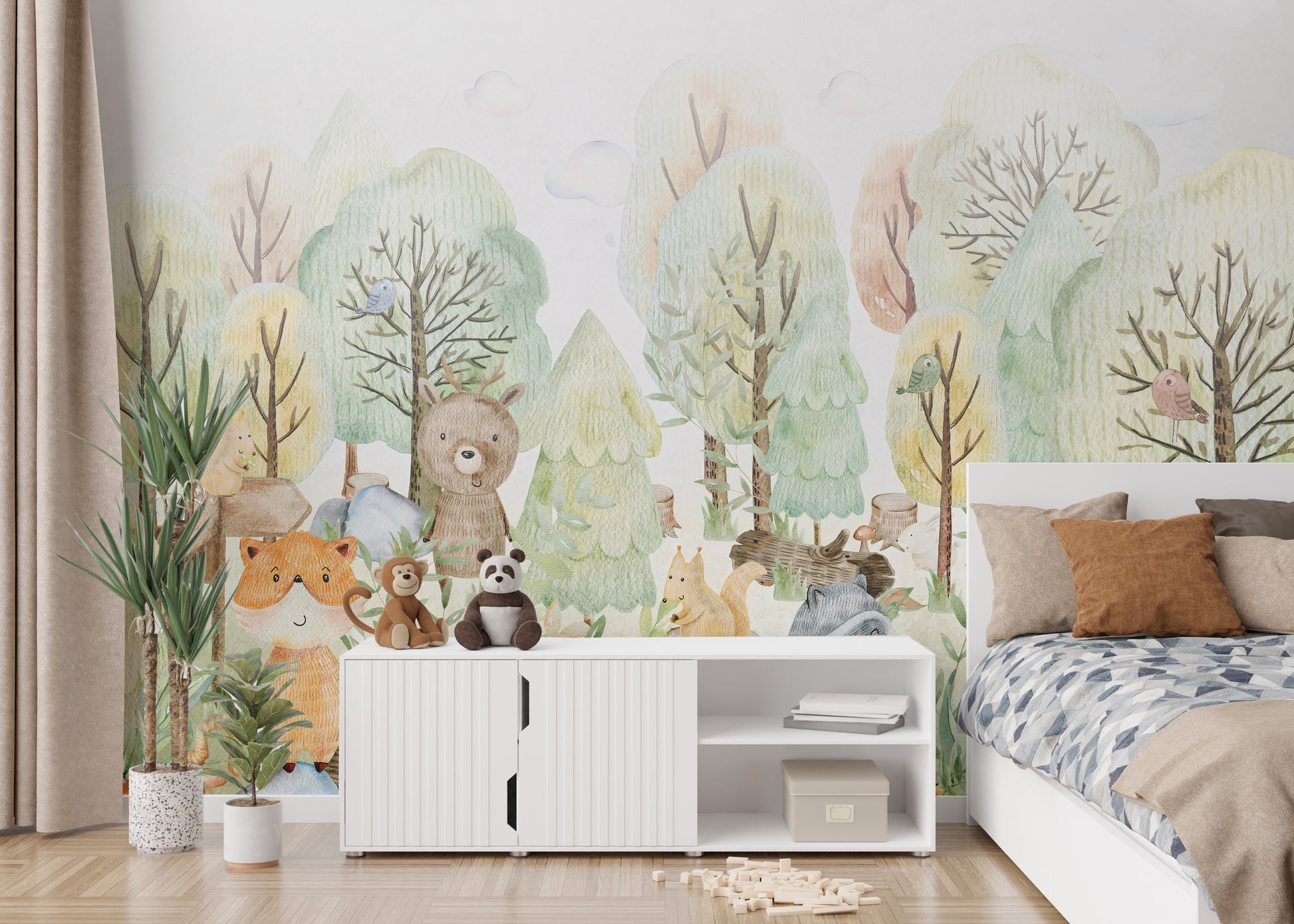 Brighten up any room with the charming Doodles Bears Animals Wallpaper Murals. This enchanting mural brings a playful, storybook feel to your walls with its delightful doodles of bears, foxes, armadillos, and whimsical trees. Each character and element, rendered in soft pastel shades, appears as if sketched by hand and gently filled with cool, soothing watercolors. This magical scene, evoking images of a gentle fairytale, instantly transforms your space into a bubbly, serene retreat.