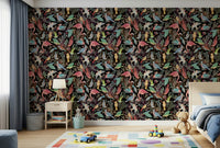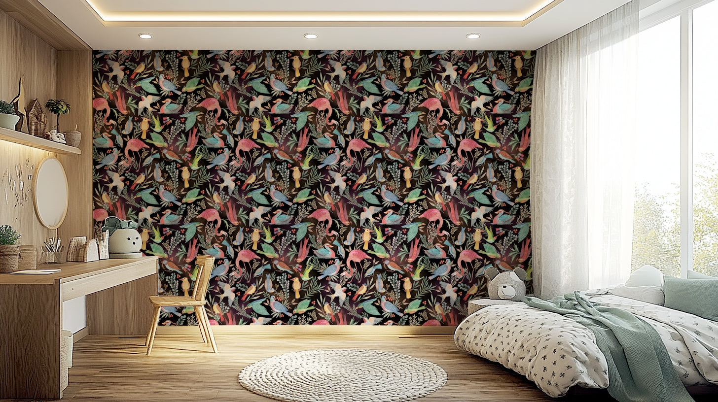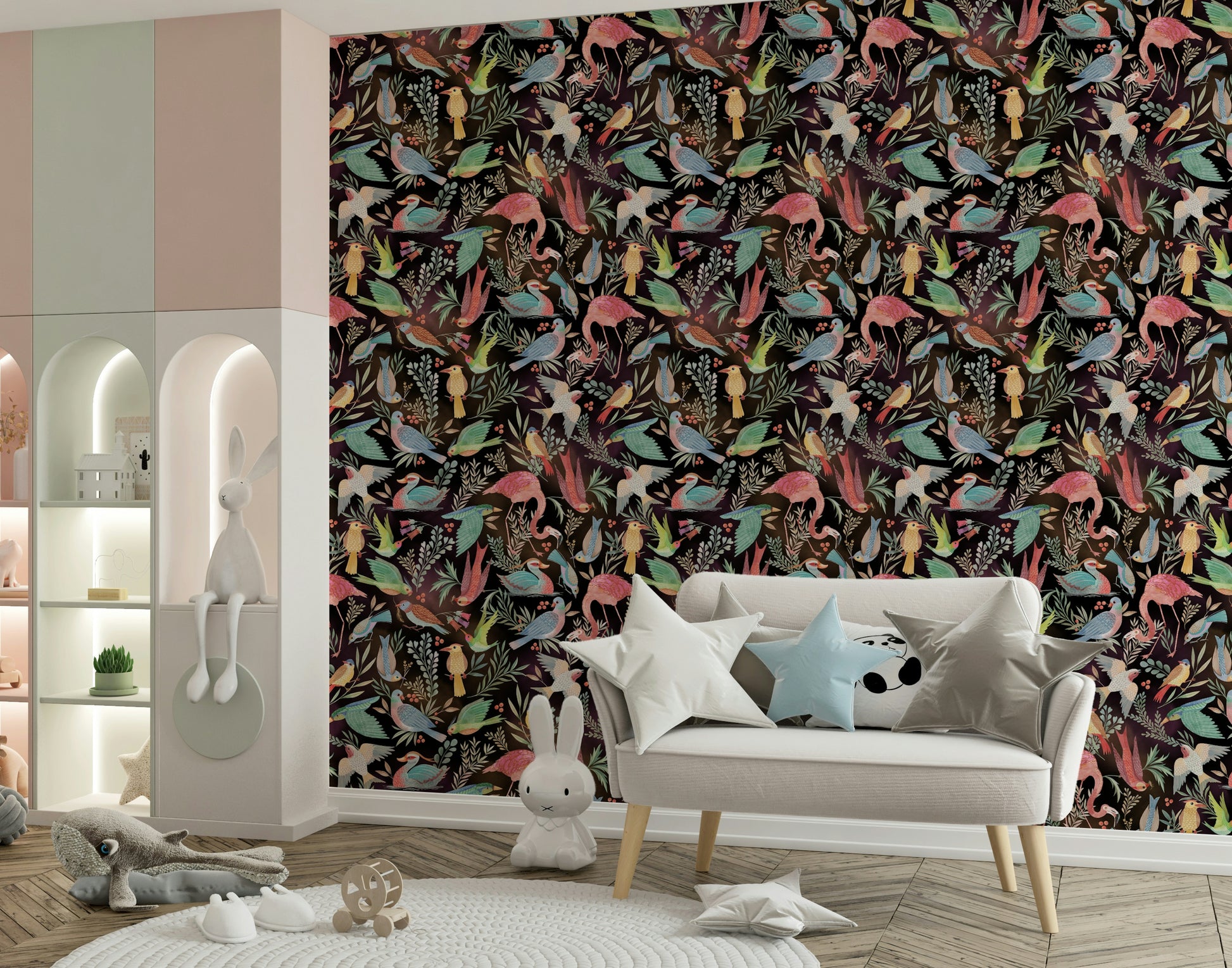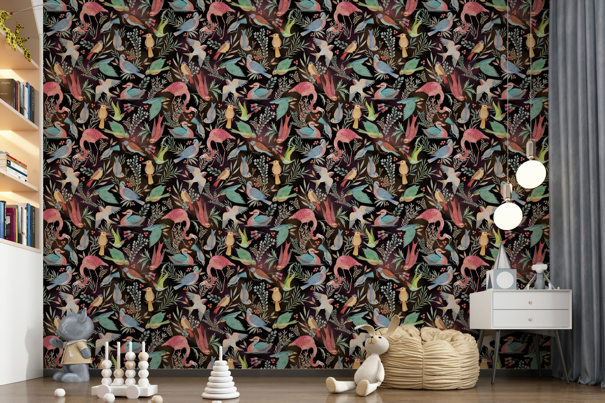 Embark on a nocturnal avian adventure with "Dream Dark Birdwatcher's." This captivating wallpaper showcases a vibrant tapestry of exotic birds—flamingos, hummingbirds, and ducks—rendered in a dreamy, watercolor style against a rich, dark background. Intricate floral details intertwine with the feathered creatures, creating a surreal and enchanting scene. The colors are both bold and muted, offering a unique blend of fantasy and elegance. Perfect for adding a touch of whimsical mystery to any digital device.