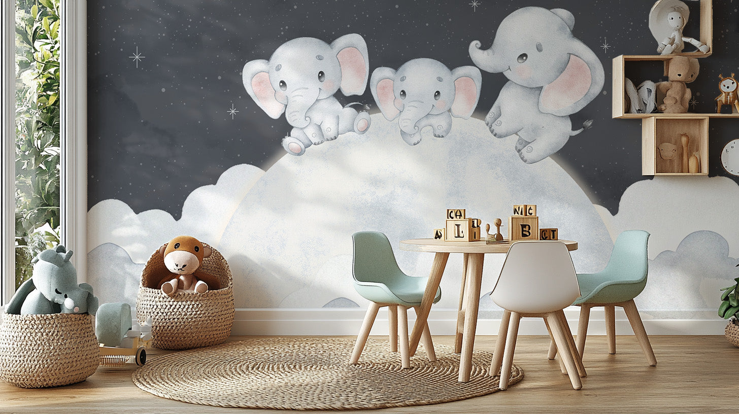 Dreamy baby elephant wallpaper brings a charming nighttime scene to life with adorable baby elephants resting on a glowing moon. The soft pastel hues, fluffy clouds, and twinkling stars create a soothing environment for nurseries and kids' rooms. This baby elephant wallpaper adds warmth and comfort while inspiring a peaceful atmosphere. The watercolor-style design blends seamlessly with various themes, making it ideal for bedtime storytelling. Crafted with high-quality materials, the Moon and Stars elephant mural offers durability and style. The whimsical night sky wallpaper makes walls look enchanting, making bedtime a magical experience for little dreamers.