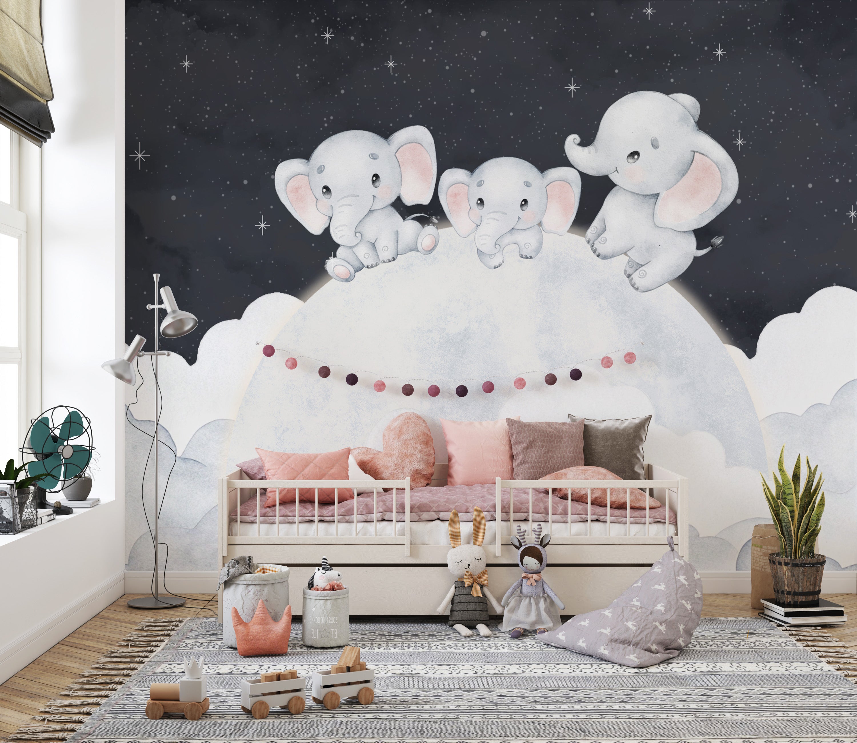 Moon and stars elephant wall mural with soft pastels