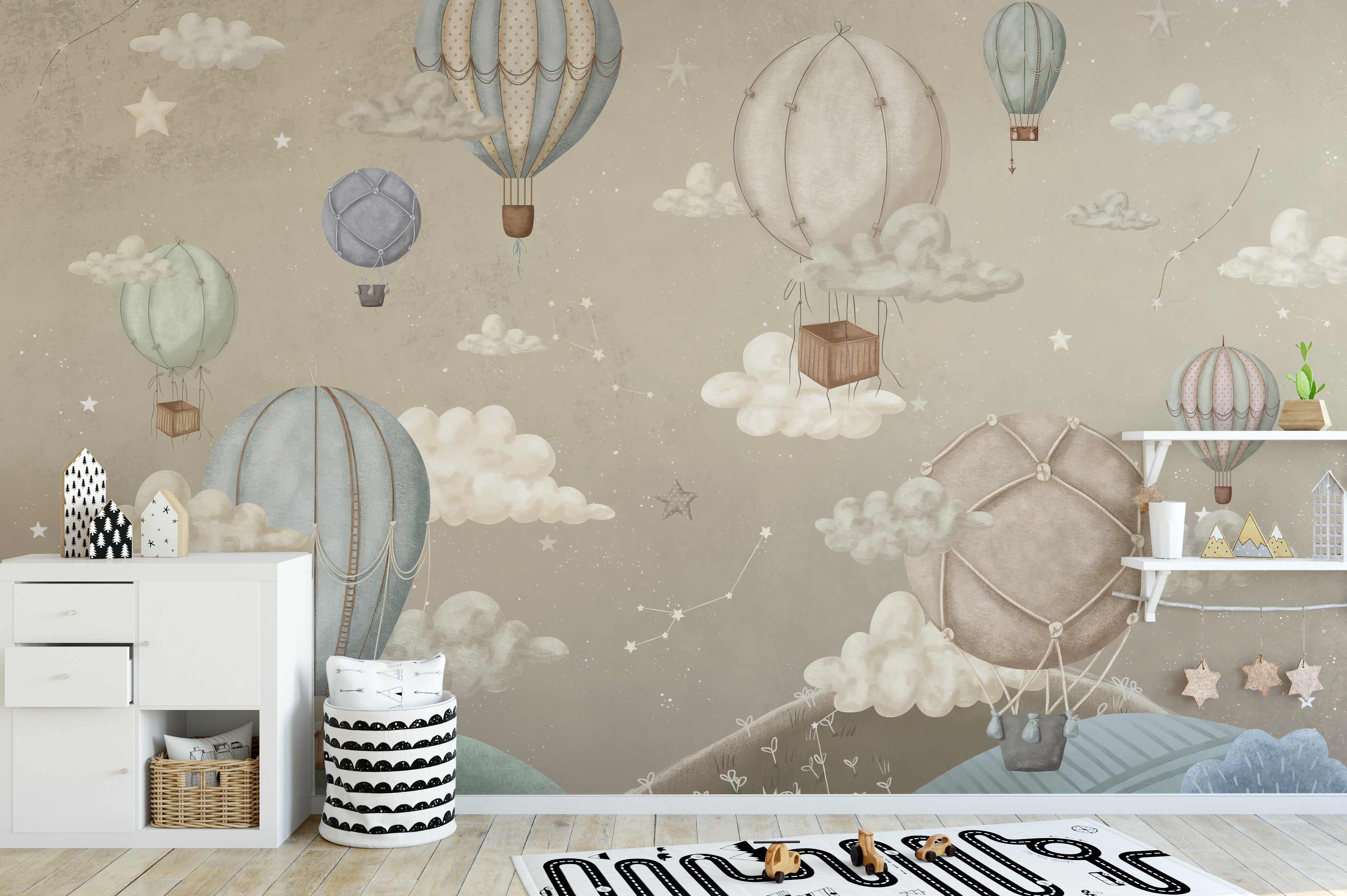 Sail beyond the ordinary on walls of wonder with our dreamy balloon adventure wall mural. Envision your little one's delight as they gaze upon gentle giants floating amidst the stars. Each balloon's intricate details tell a story, crafting a room that whispers of adventures in the sky. This balloon wallpaper serves as a backdrop for childhood fantasies, a canvas where dreams take flight and the ceiling is never the limit. Turn the nursery or playroom into a chapter of their own fairytale.