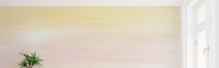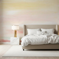 This elegant wallpaper for walls transforms any room into a tranquil retreat. It features a soft, abstract design with broad, flowing brushstrokes that create a gentle color gradient. The palette blends warm yellows at the top into delicate blush pinks and creams, subtly transitioning to a serene hint of muted teal and coral along the bottom. This painterly style evokes the peaceful calm of an early morning sky or a hazy sunset. The visible canvas texture adds an authentic, artistic depth, enhancing the handmade feel of the design. Install this wallpaper in bedrooms, living rooms, or dining areas to foster an atmosphere of quiet serenity. It beautifully complements minimalist, bohemian, or contemporary interiors, providing a warm, inviting backdrop that elevates your living space with understated elegance.