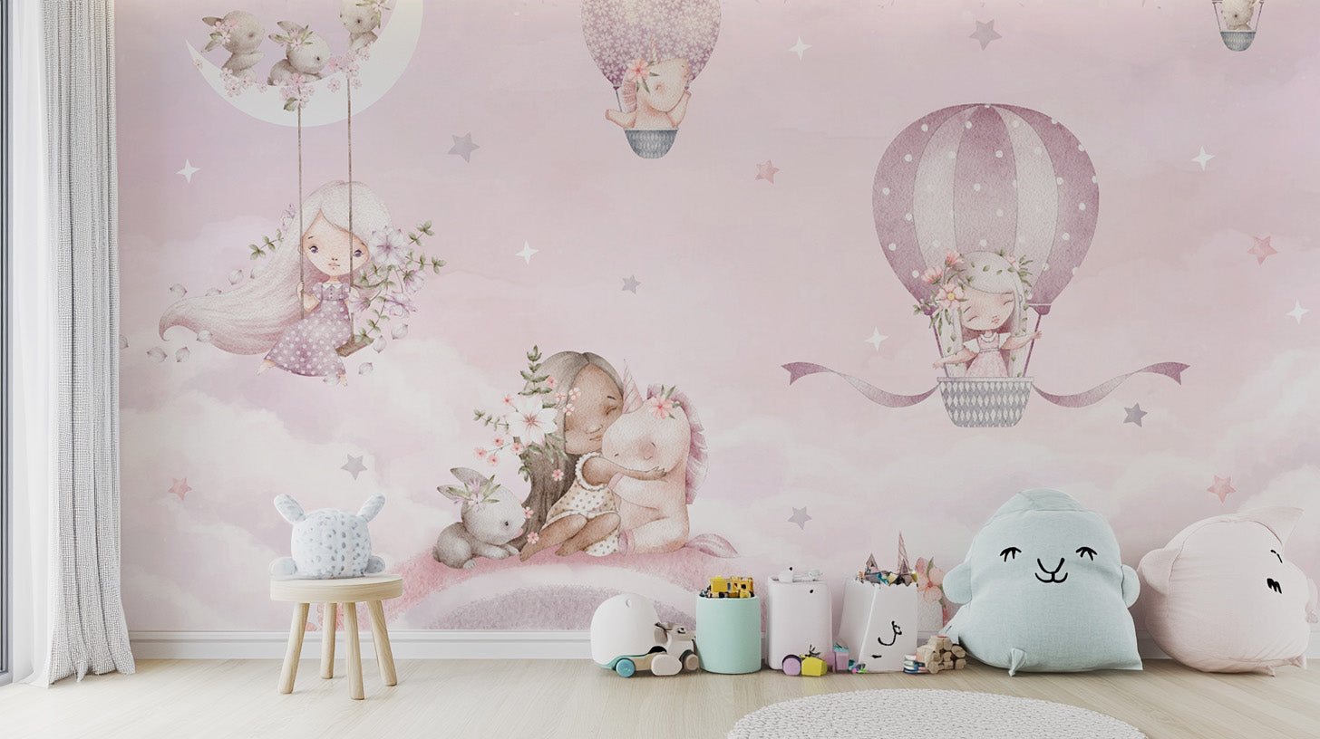 The dreamy unicorn & balloon wallpaper creates a magical setting with soft pastel clouds, floating hot air balloons, and adorable unicorns. Gentle watercolor strokes bring a fairy tale touch, perfect for a girls' bedroom wallpaper or nursery. A moon swing, twinkling stars, and delicate florals enhance the charm, offering a peaceful atmosphere. The hand-drawn details blend beautifully with a rainbow and unicorn wallpaper theme, adding warmth and fantasy to the walls. Ideal for creating a dreamy space, this fantasy kids' wallpaper brings unicorns, bunnies, and floating balloons together in a whimsical pastel world filled with soft hues.