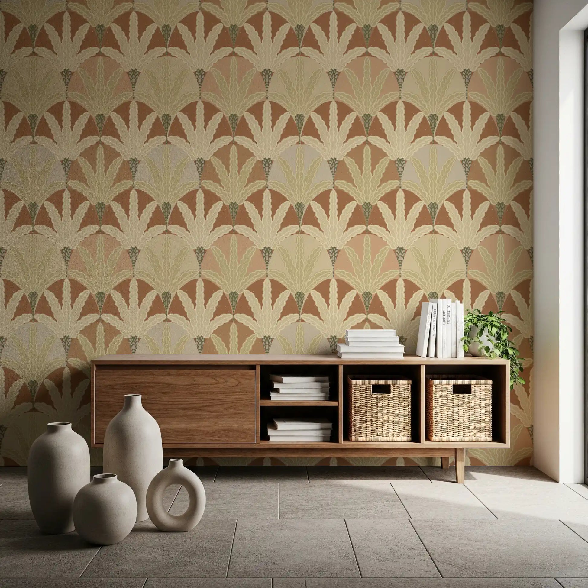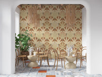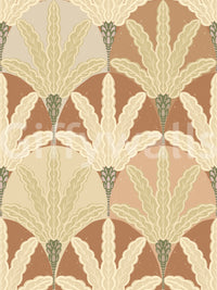 Transform your interiors with this distinctive wallpaper for walls, featuring a captivating pattern of stylized fan-like foliage. Geometric arcs and a central bud motif repeat across the design, creating a harmonious and flowing visual rhythm. The style blends Art Deco elegance with Mid-Century Modern charm, offering a vintage yet contemporary appeal. A warm, inviting palette defines this piece, showcasing rich terracotta, soft sage green, creamy beige, and subtle blush pink. This earthy color scheme adds instant warmth and sophistication to any space. It works beautifully in living rooms, dining rooms, serene bedrooms, or an inspiring home office, giving walls a refined and tranquil atmosphere.