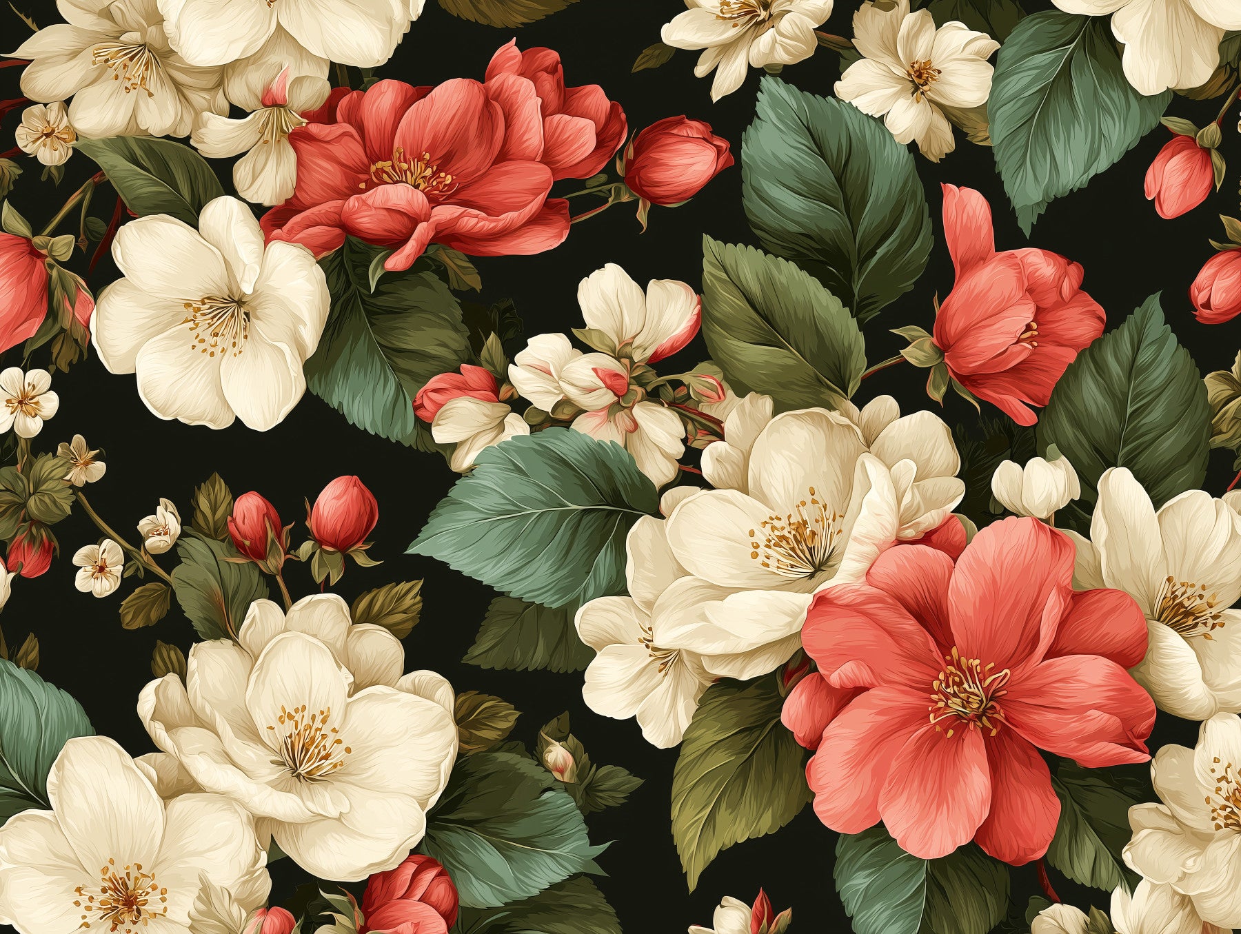Transform your space with this elegant floral wallpaper for walls. The design features large red and cream flowers with green foliage against a dark background. The seamless pattern ensures a stunning impact in any room. Use it to create a luxurious bedroom, a sophisticated living room, or a charming dining area. It's a fantastic way to introduce a touch of floral elegance to your home. This design complements interiors with a classic or modern style. It works very well in rooms with neutral colors.