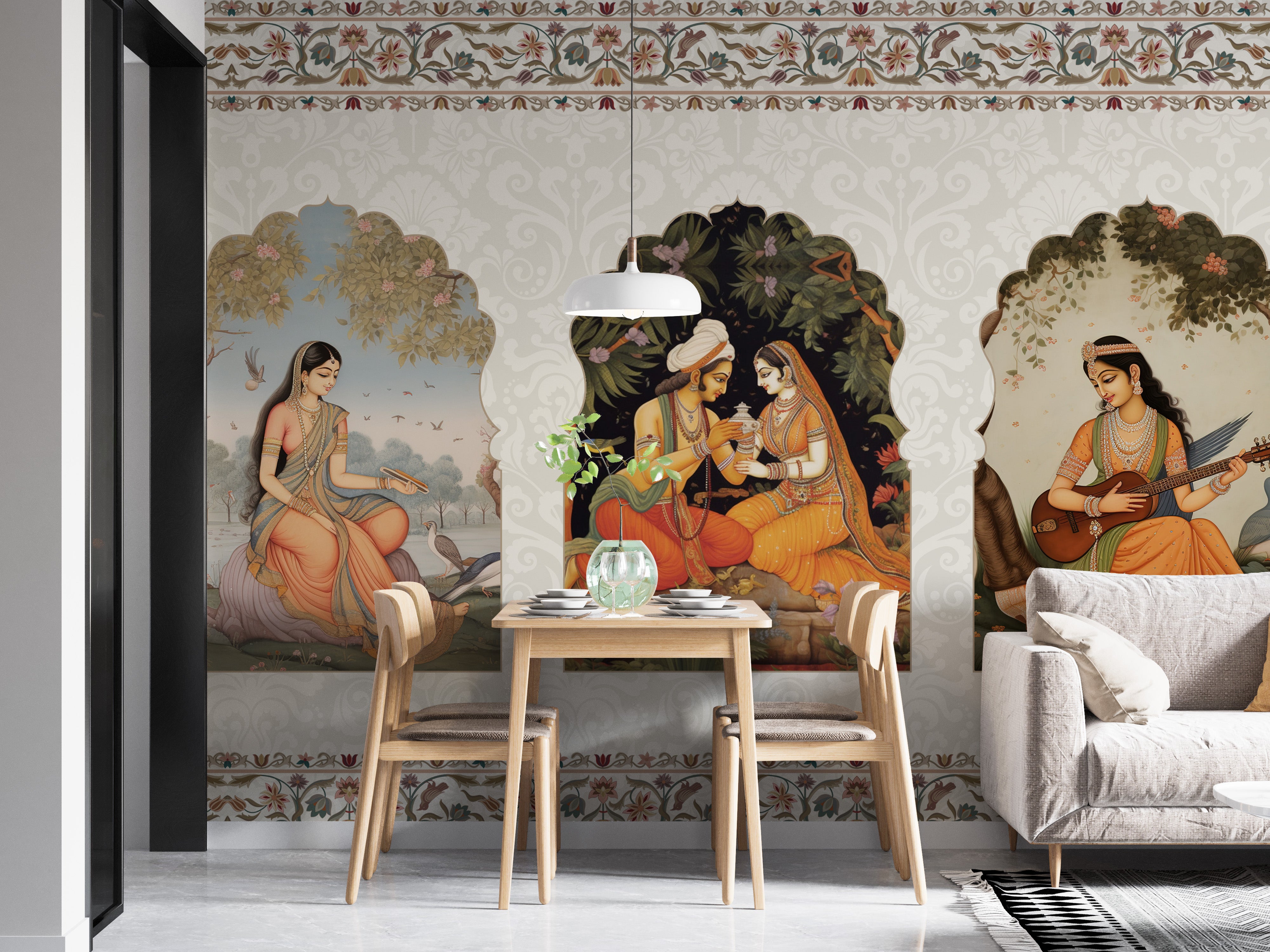 The elegance of the East royal mural is a vintage wallpaper that celebrates the storied grandeur of India's royal heritage. Each panel is a window into a bygone era, where Indian princesses are depicted in moments of grace and cultural richness. Their poised elegance is captured in vibrant hues and delicate details, bringing regal beauty to any room. This mural is a tribute to the timeless tales of Indian lore, crafted with a finesse that bridges past and present. Ideal for those who appreciate historical depth and artistic beauty, this Princesses wallpaper is more than a decor piece it's a narrative tapestry that adorns your walls with stories of majesty and tradition.