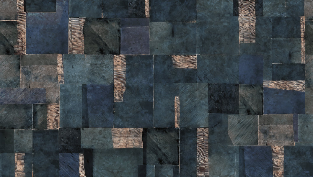 Blue abstract wallpaper with metallic tones for modern decor.