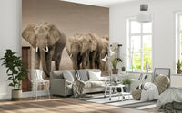 A majestic herd of elephants strides across the savanna in this sepia-toned image. The texture of their skin and tusks are captured in rich detail. Display this wallpaper for walls in living rooms or offices to add an element of the wild. The monochromatic scheme gives it a timeless feel that elevates classic and modern spaces. The design complements interiors with its focus on natural form and organic textures. Introduce a touch of Africa into your space.