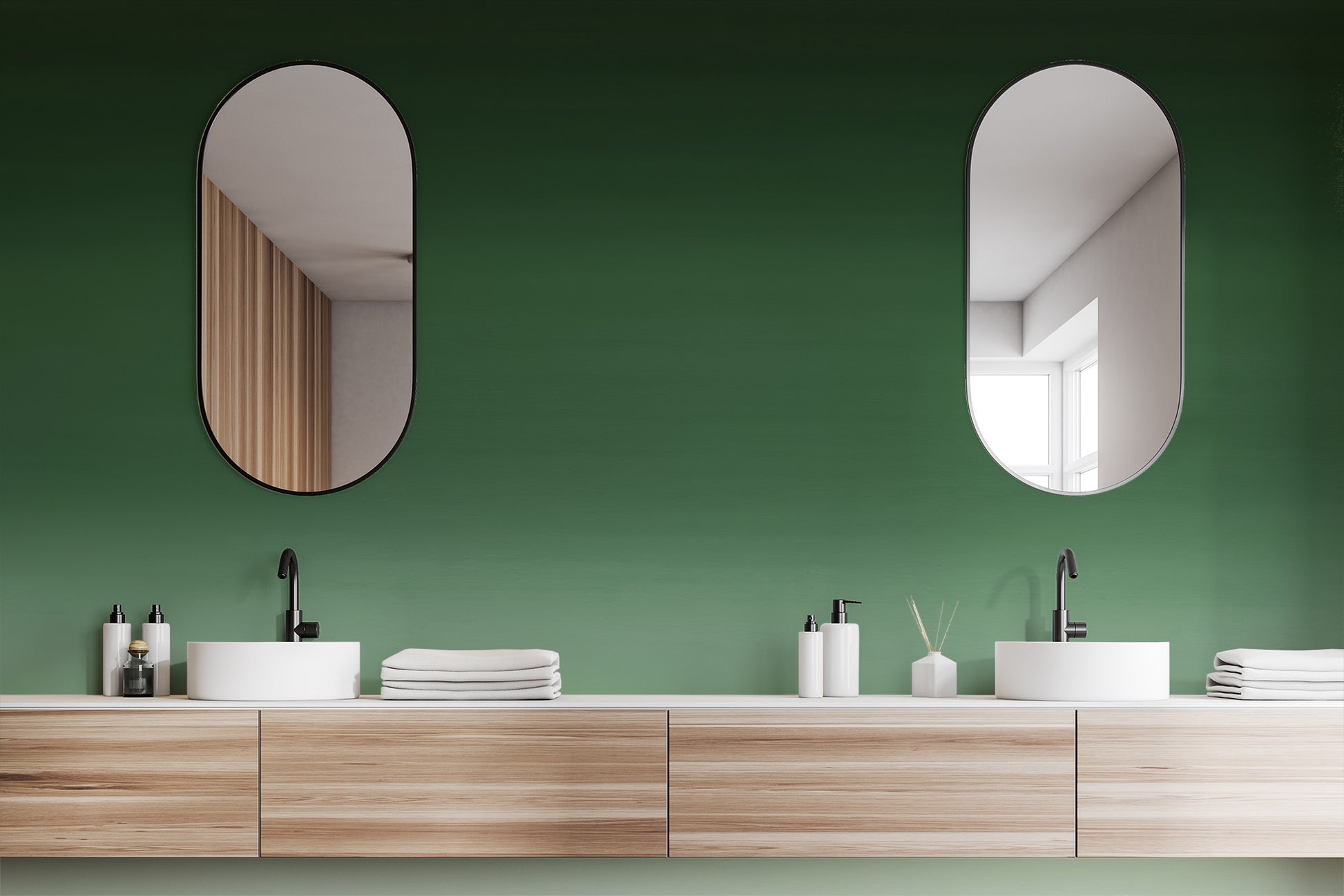 Elegant emerald gradient wallpaper for a spa-like bathroom vibe.