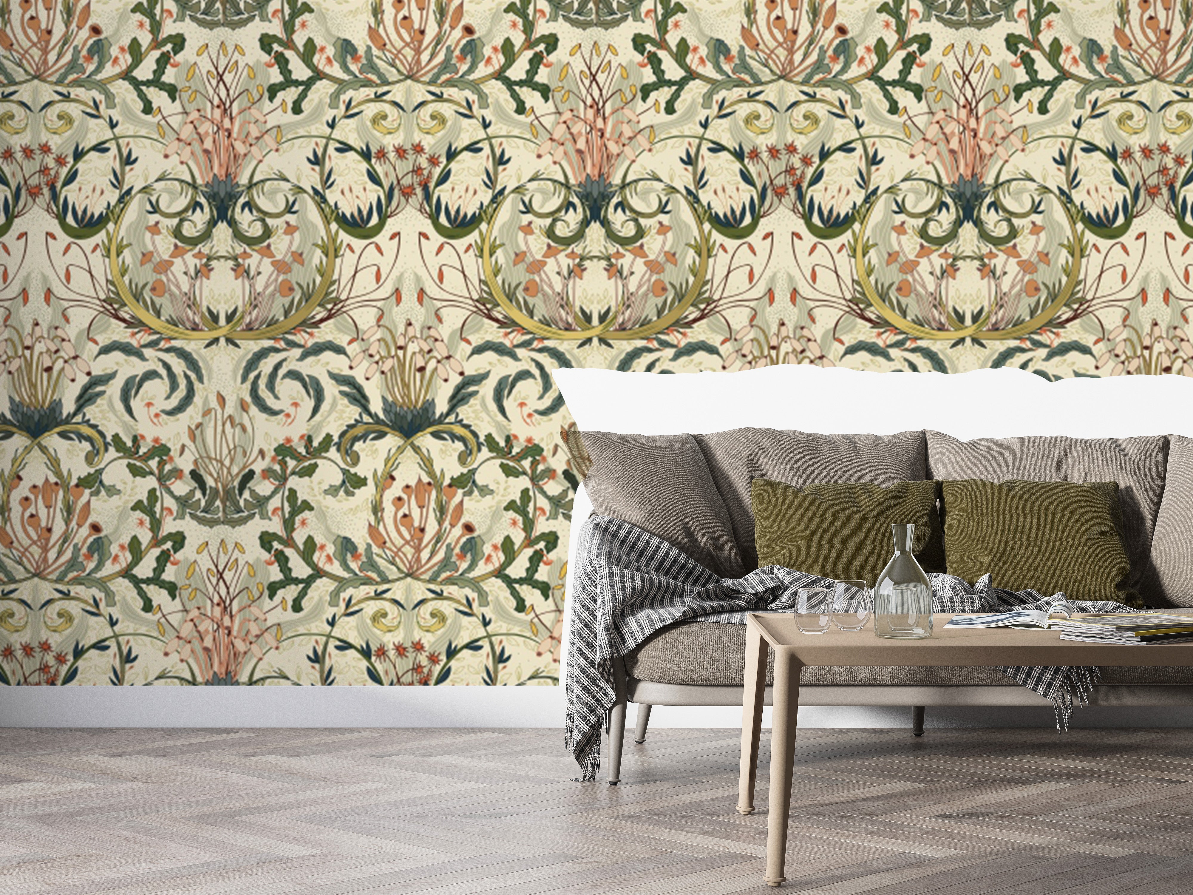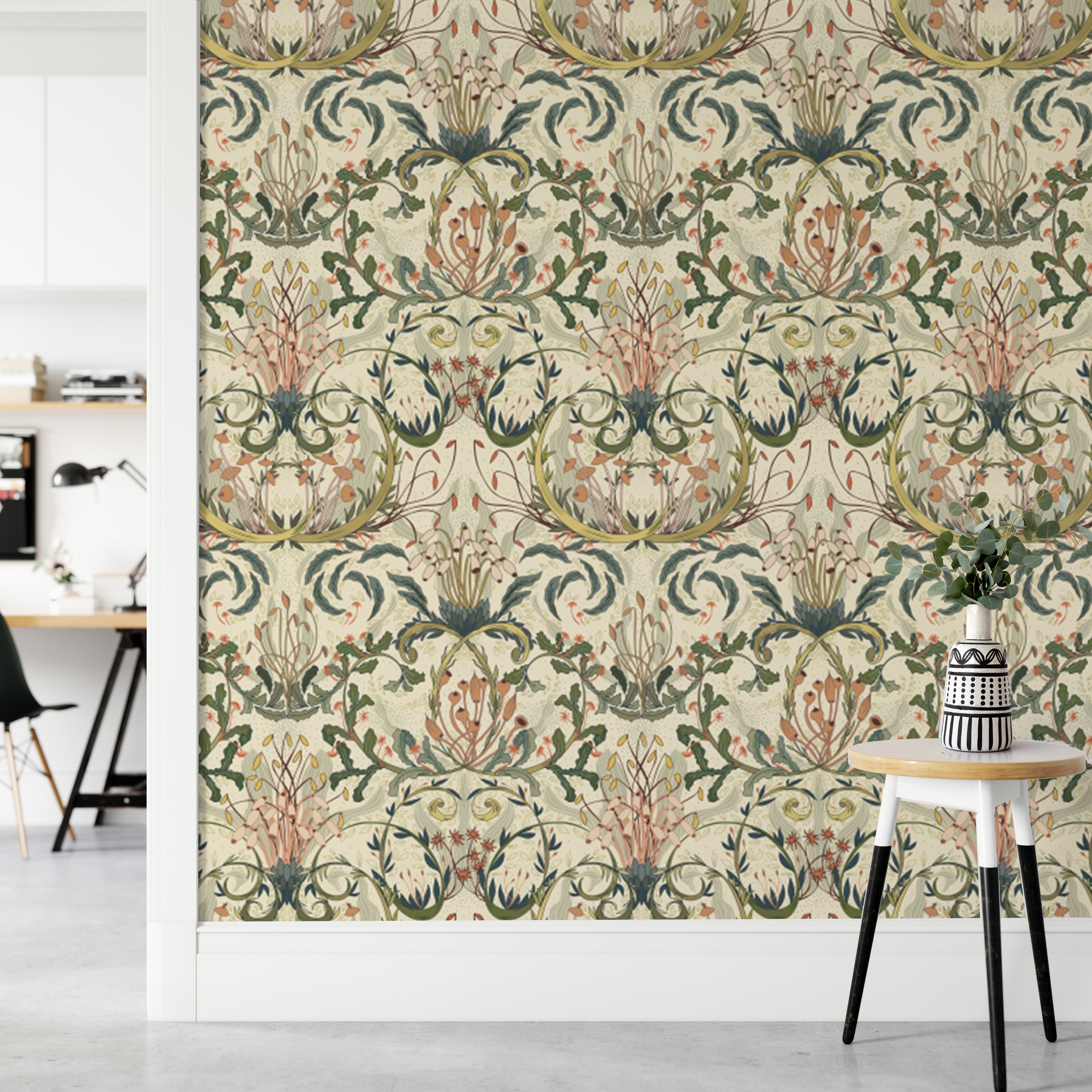 Discover a touch of nature's whimsy with the Enchanted Forest Tapestry Wallpaper, perfect for dining room wallpaper. This enchanting print weaves together an intricate tableau of woodland flora. Gentle hues of green, coral, and ivory bloom across your walls, inviting the serenity of the outdoors into your mealtimes. Create a stunning backdrop for feasts and conversation, as the pattern's delicate artistry adds a visual feast of its own. Embrace the allure of the forest and give your dining area a fresh, botanical vibe with this captivating wallpaper design.