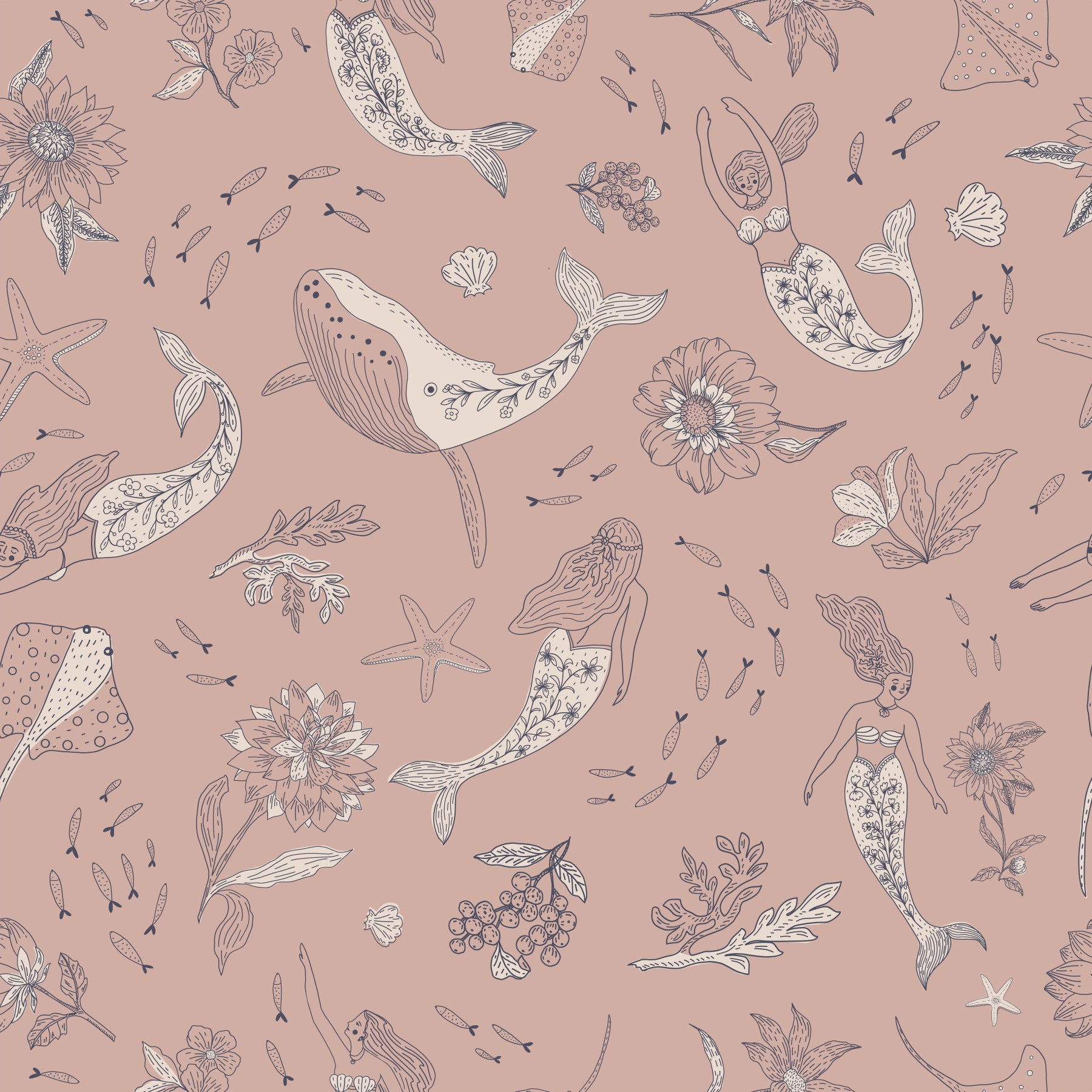 Dive into a dreamy underwater world with this enchanting wallpaper. Delicate line drawings of graceful mermaids, playful whales, and vibrant floral elements create a whimsical and serene atmosphere. The soft blush pink background enhances the ethereal quality of the design, making it perfect for a tranquil bedroom or calming nursery. The seamless pattern ensures a cohesive and aesthetically pleasing look in any space, adding a touch of magic to your walls. This wallpaper effortlessly blends elements of nature and fantasy, resulting in a sophisticated yet playful design that's both calming and enchanting.