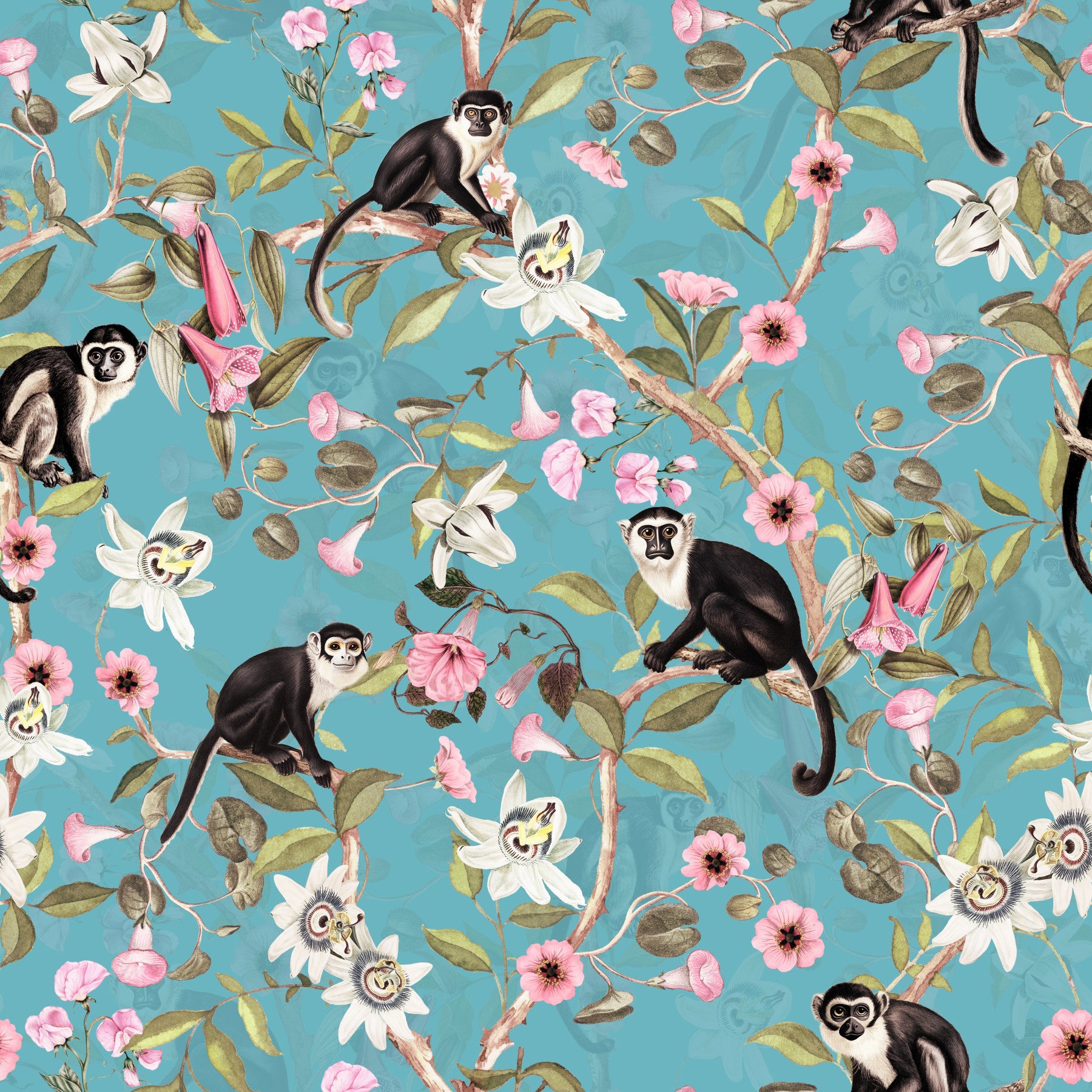 Enchanted Primates transports you to a lush, vibrant jungle paradise. This wallpaper design features a captivating interplay of meticulously detailed monkeys and exquisitely rendered flowers, all set against a soothing teal background. The vintage-inspired aesthetic evokes a sense of timeless elegance, while the playful monkeys inject a touch of fun and character. The soft, muted colors and intricate details create a serene and calming atmosphere, perfect for adding a touch of exotic charm to bedrooms, living rooms, or any space seeking a unique and sophisticated touch.