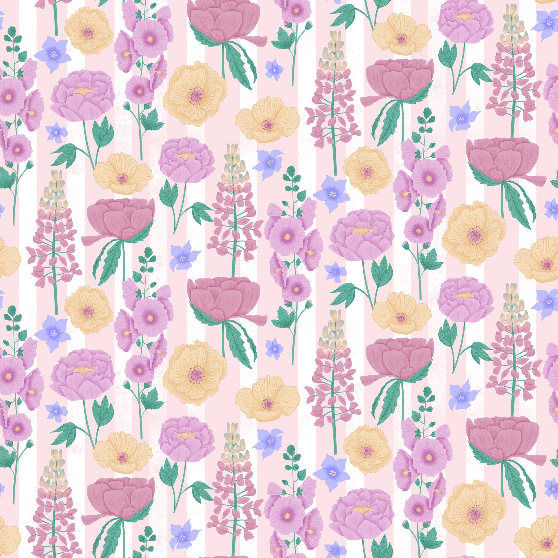 Step into the serene beauty of a traditional English garden with this captivating wallpaper. 'English Garden' evokes the charm of a blooming paradise, featuring a delightful array of hand-drawn style peonies, poppies, lupines and forget-me-nots in soft, romantic hues. The pastel pink and white striped backdrop lends a vintage, elegant touch, creating a sense of timeless sophistication. Delicate details and a gentle color palette create a calming and inviting atmosphere, perfect for creating a relaxing and visually pleasing space. Transform any room into a tranquil floral retreat with this enchanting design, and infuse your space with the romantic essence of an English summer.