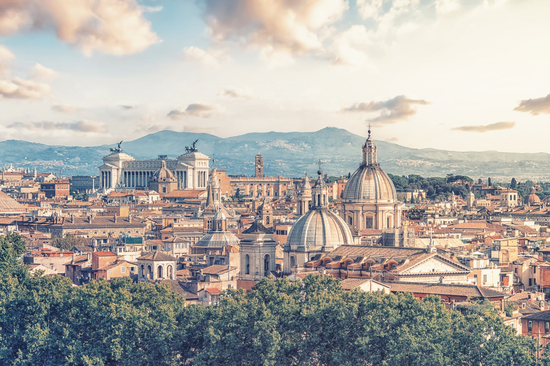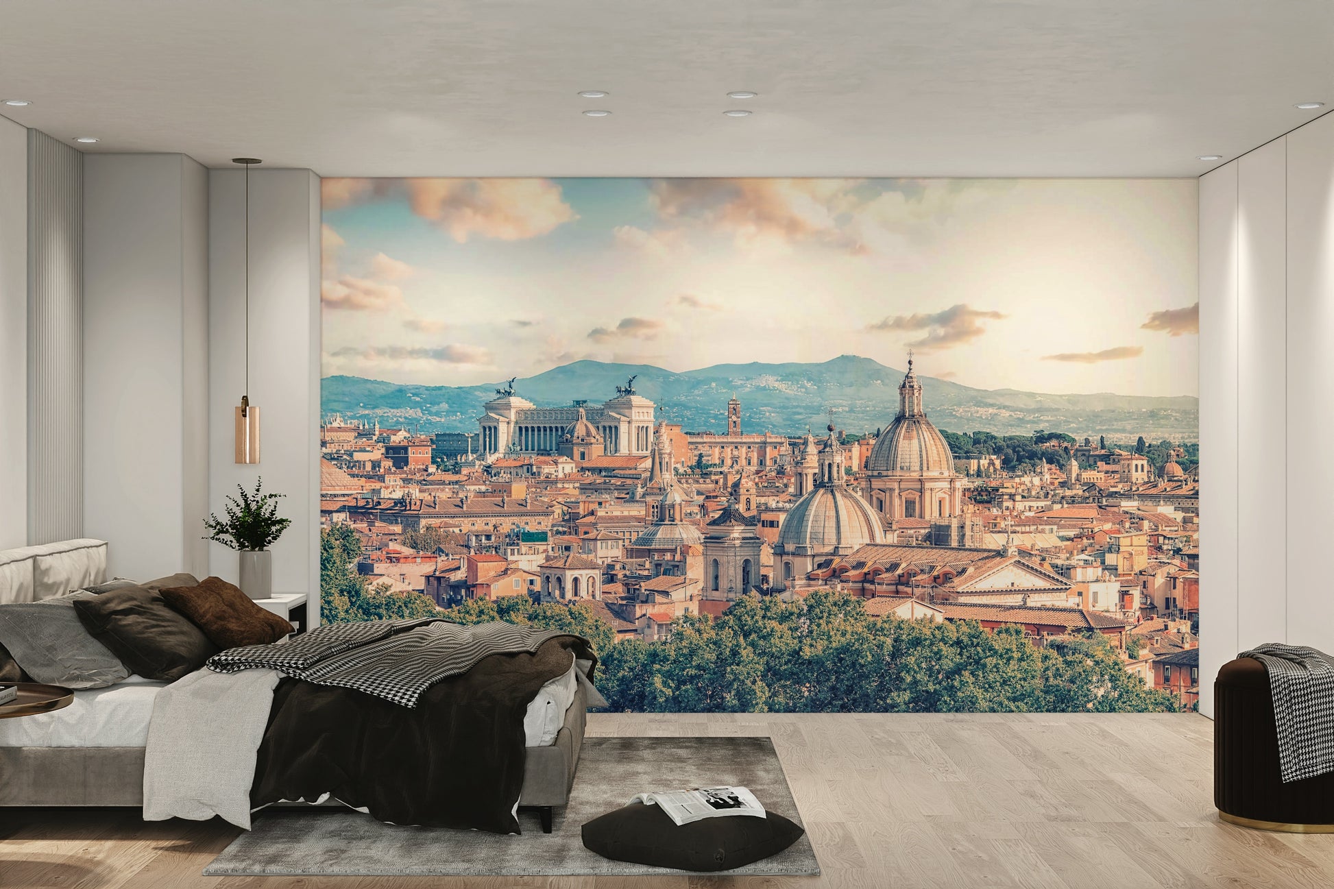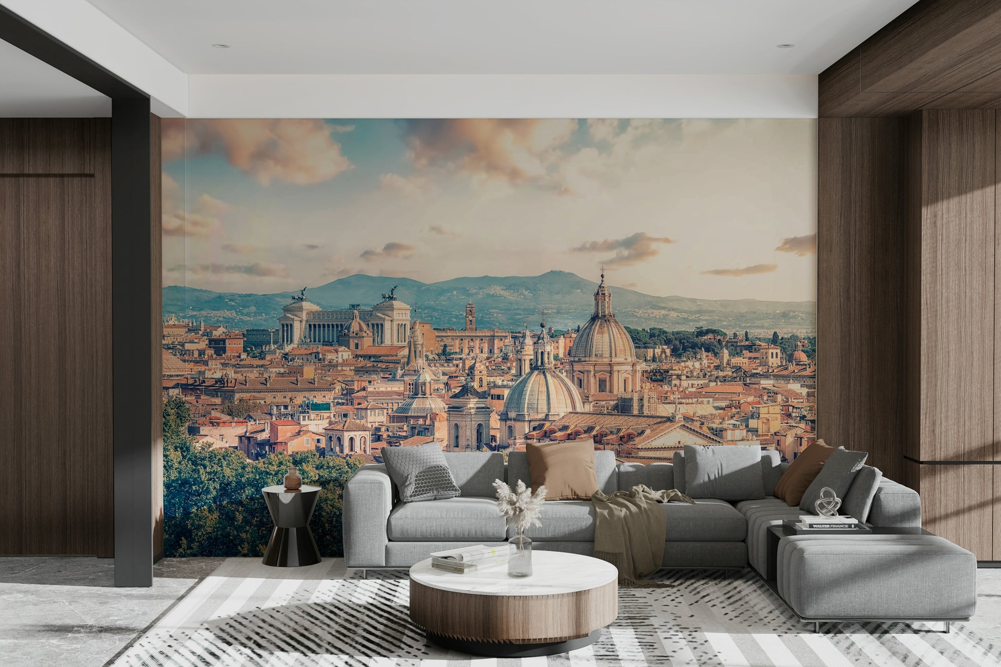 Bring a touch of European elegance to your interiors with this breathtaking Roman skyline. The picturesque scene features iconic buildings under a tranquil sky, lending a sense of grandeur to any space. Use this wallpaper for walls to enhance your dining room, bedroom, or entryway. The design's muted tones and refined aesthetic work wonderfully with both modern and traditional decor, creating an inviting atmosphere with a view.