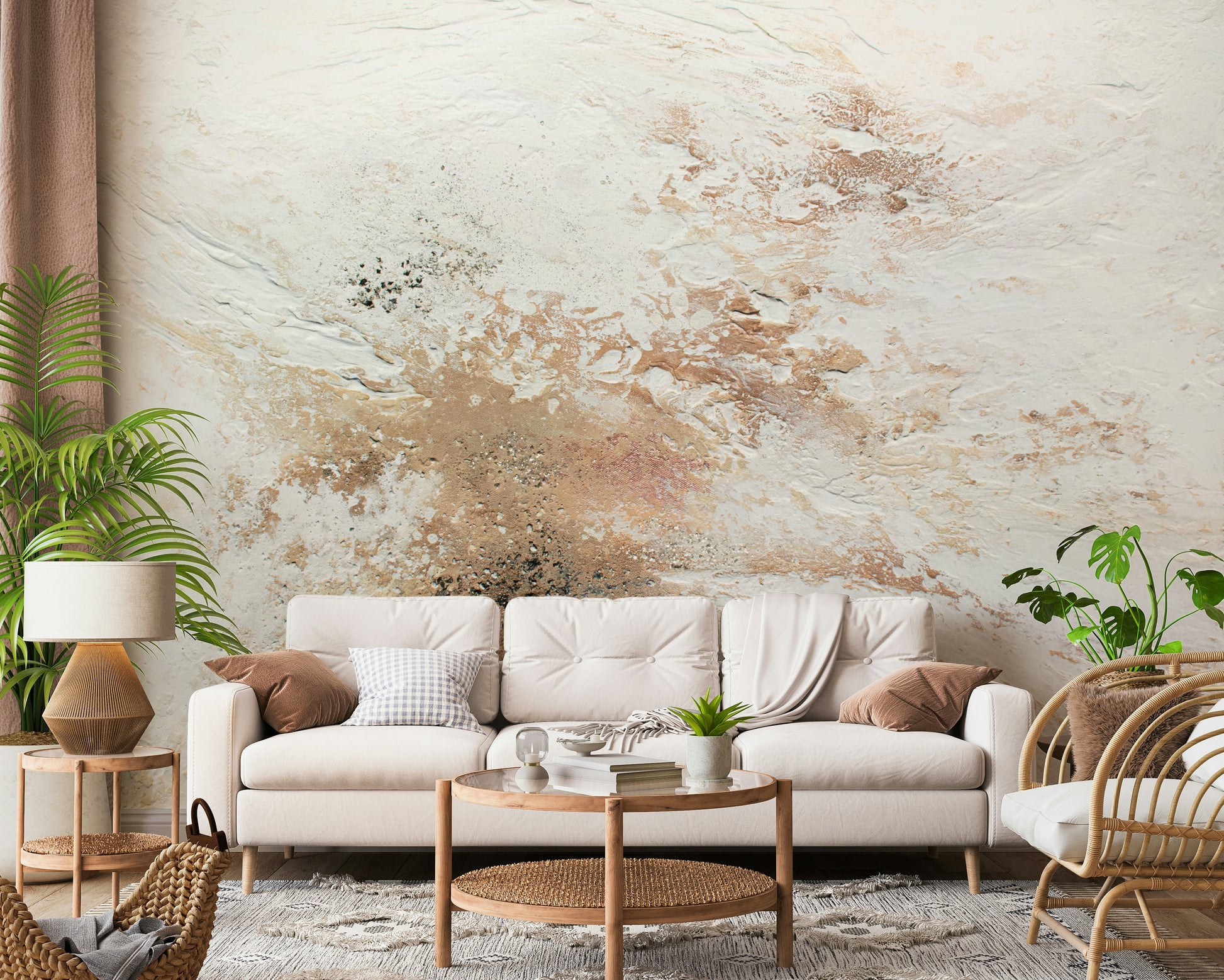 Textured wall mural with painterly, ethereal patterns creating a calm and elegant accent wall.