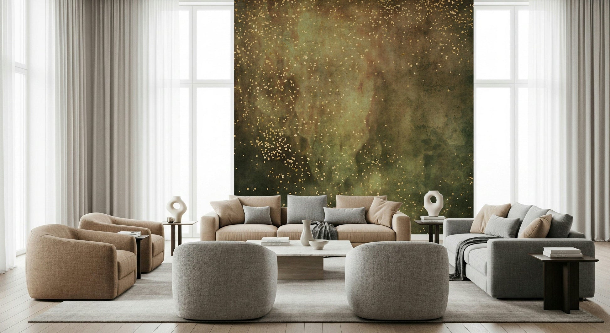 Imagine a fine dust of gold dancing across a misty landscape. The background features a mix of soft browns and greens. Golden specks capture and reflect light, creating a mesmerizing effect. Suitable for a living room or bedroom, this design adds a unique touch. The subtle pattern is perfect as wallpaper for walls, enhancing the interior without dominating the space. It blends smoothly with modern and classic furniture.