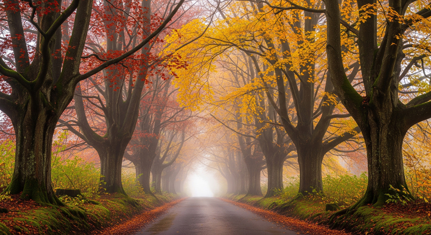 Invite the beauty of autumn into your home with this enchanting woodland path design. Trees in shades of scarlet and gold line a foggy lane, creating an inviting and atmospheric focal point. This wallpaper for walls adds visual depth, working wonderfully in hallways, bedrooms, or studies to create a sense of escape and peace. The mist softly diffuses the sunlight, bathing the scene in a dreamy glow. Introduce a sophisticated, natural element to your space with this tranquil landscape.