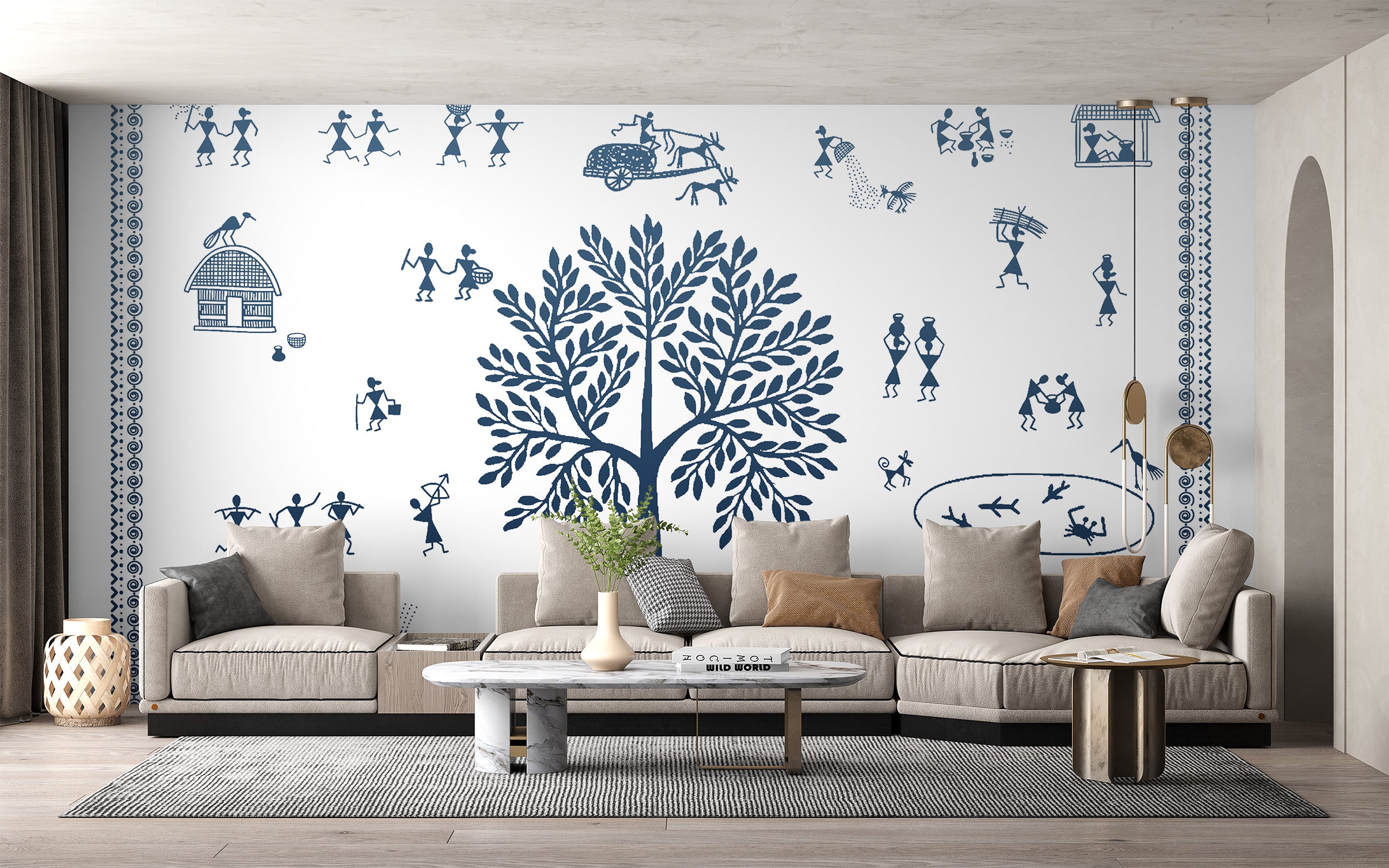 Step into a narrative woven through time with the ethnic village wallpaper mural. This wallpaper for walls is a picturesque portrayal of communal harmony, featuring scenes of daily life in the Warli style. Each frame tells a story of age-old traditions, with a grand Tree of Life as its centerpiece, symbolizing growth and connectivity. The detailed border frames the mural, inviting viewers on a visual journey through the rhythms of rural life. Whether it's for a living room or a study, this wallpaper mural adds a touch of cultural richness, making it more than just a piece of decor but a homage to a timeless art form. Celebrate heritage and create a focal point that's both artful and conversation-inspiring with the ethnic village wallpaper mural.