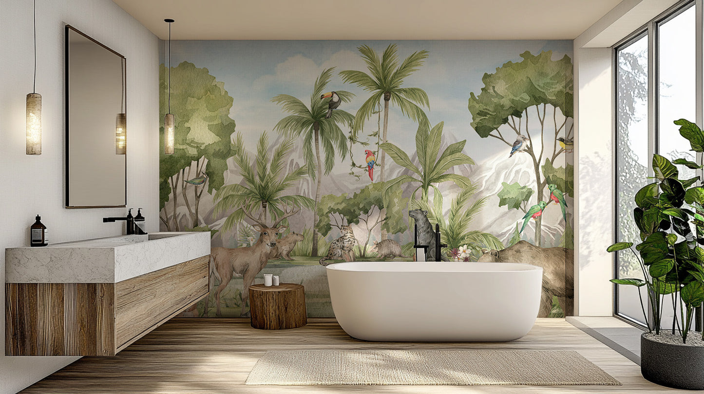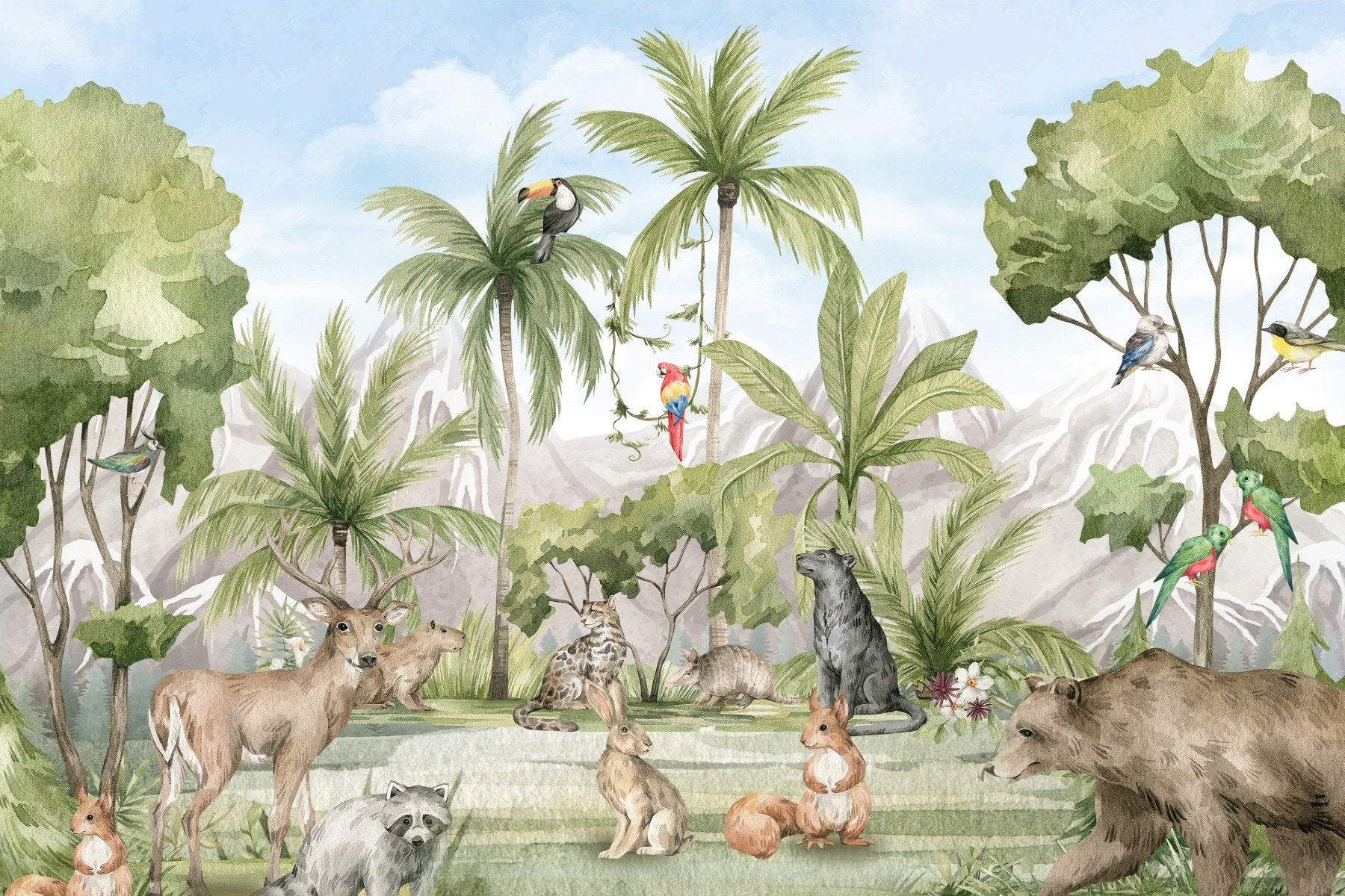 The exotic creatures landscape art mural is a captivating piece that brings the vibrancy of a tropical jungle into your surroundings. This animal wallpaper is rich with the diversity of wildlife, featuring an array of animals from the quiet strength of deer to the playful leap of monkeys amidst lush foliage. As a piece of jungle wallpaper, it portrays a world teeming with life, with each creature captured in exquisite detail against the backdrop of their natural habitat. It's an artful celebration of the wild, inviting the spirit of adventure and exploration to those who gaze upon it. This wildlife wallpaper is perfect for anyone looking to add a touch of nature's untamed beauty to their environment, creating a visual safari that inspires awe and wonder with the turn of every glance.