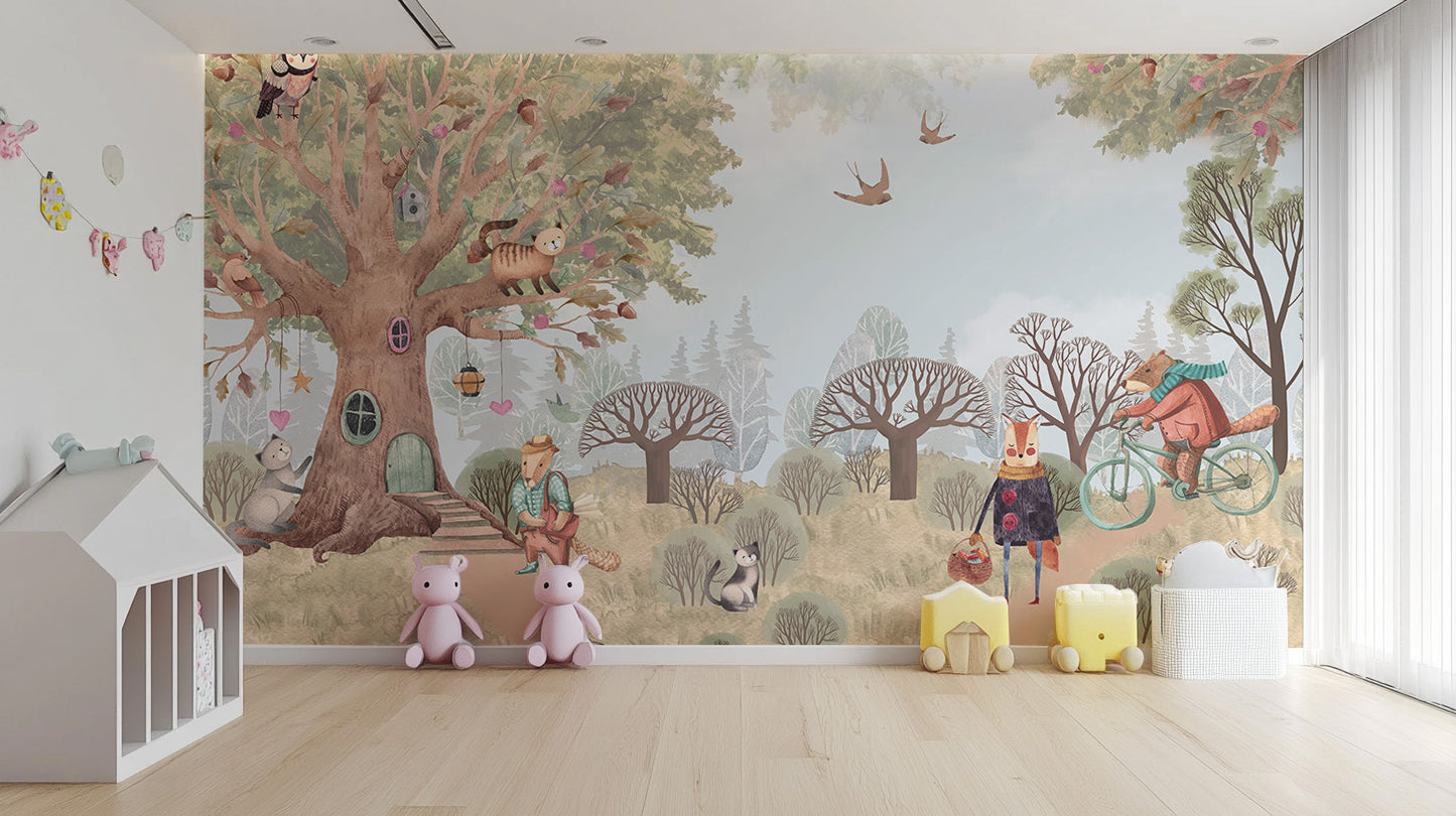 Embark on a delightful journey through the fairy-tale critter countryside mural, where whimsy meets charm right on your walls. This enchanting nursery wallpaper is a tapestry of adventure, featuring frolicsome animals and lush, storybook scenery that beckons little imaginations to wander. Each brushstroke tells a tale of woodland merriment, where foxes pedal bicycles and wise owls hold court in grand treehouses. Perfect for a child's bedroom or play area, this mural creates a captivating backdrop for countless tales of bravery and friendship. Crafted with care, the mural is a gateway to a world of pastoral beauty and playful companions that'll spark joy and creativity in any young dreamer's sanctuary.