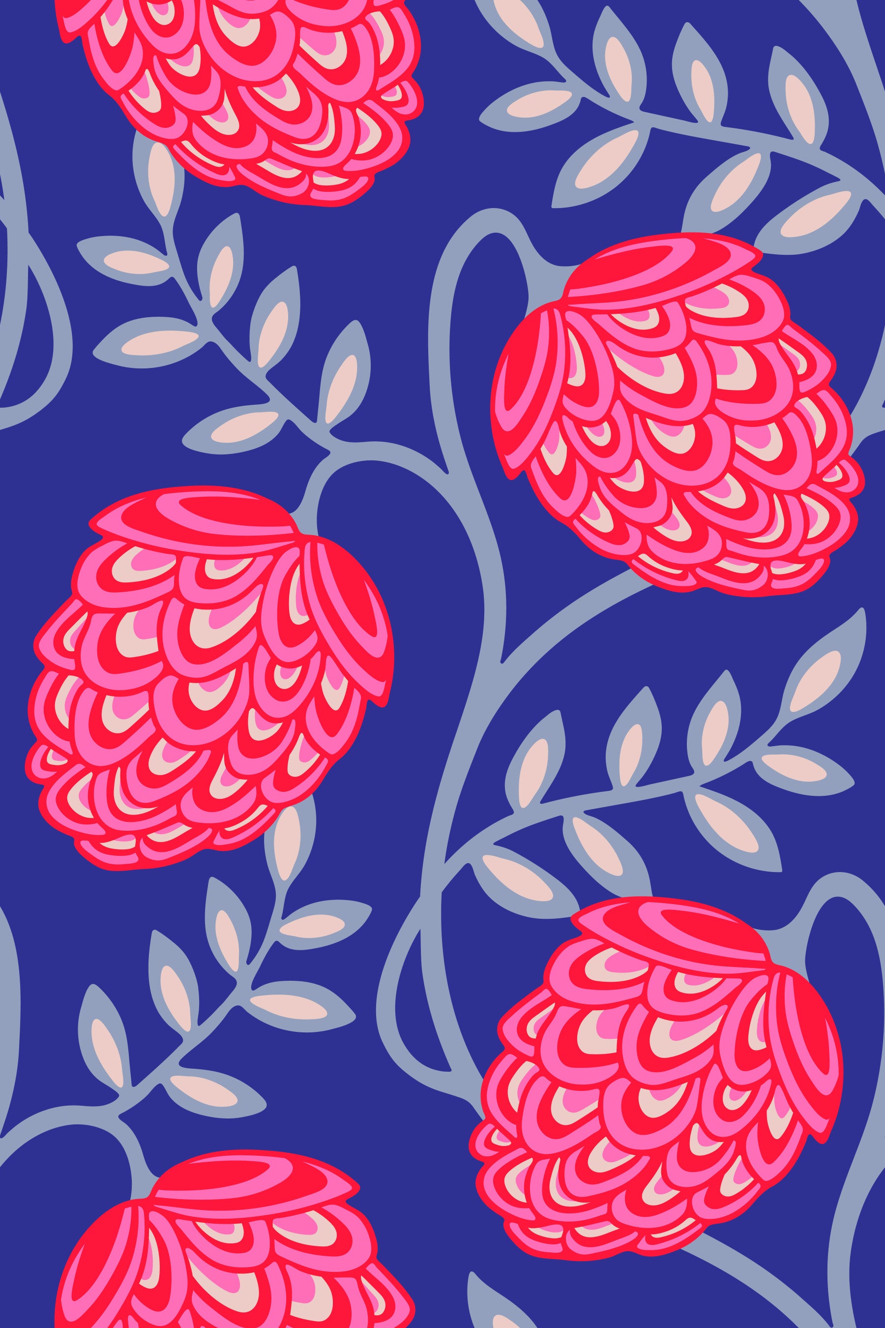 Immerse yourself in the enchanting allure of Fantasia a wallpaper design that seamlessly blends botanical wonder with modern Art Nouveau flair. This organic design features stylized flower vines and leaves crafted with a gentle, curving aesthetic that is a modern twist on classic Art Nouveau style. The bright vibrant palette of fuchsia, pink, red and lavender purple on royal blue creates a fun and colorful ambiance, perfect for bedrooms, living rooms, or any space needing a pop of bright energy. This pattern design is also available in Other Colourways too! Original wallpaper pattern design by Jackie Tahara of UnBlink Studio.