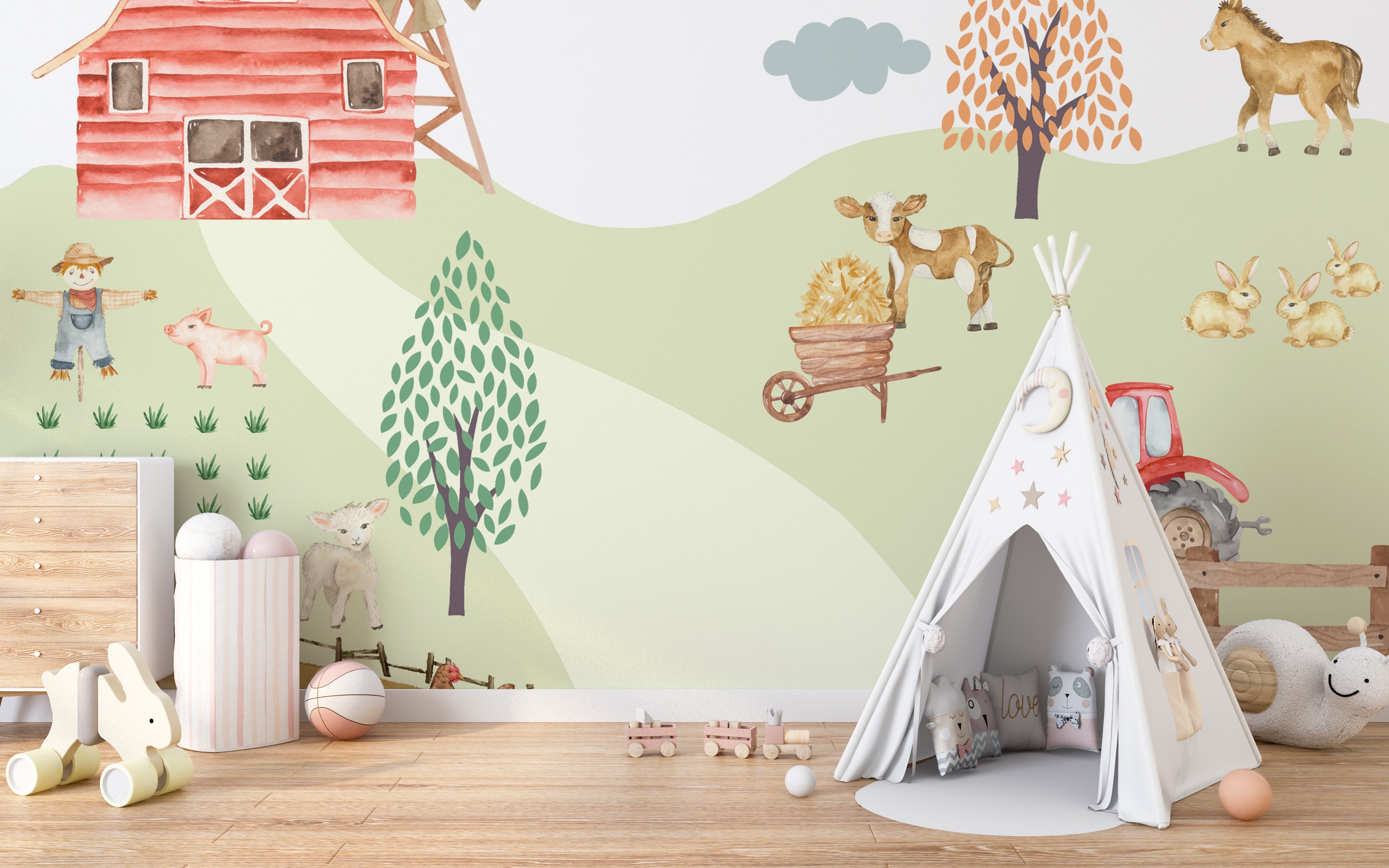 Bring sunshine and farmyard fun to your child's room with this well-designed wallpaper. Featuring playful farm animals, a lovely red barn, lush green fields, and a curious tractor, this design inspires the imagination and brings warmth to any room. This wallpaper works very well in brightening and combining a sense of coziness in nurseries, playrooms, or children's bedrooms. Made from quality materials, it will last well and is very easy to put up and remove when it's time for a change. Bring farm joy inside, and let them have a creative free run on this wall.