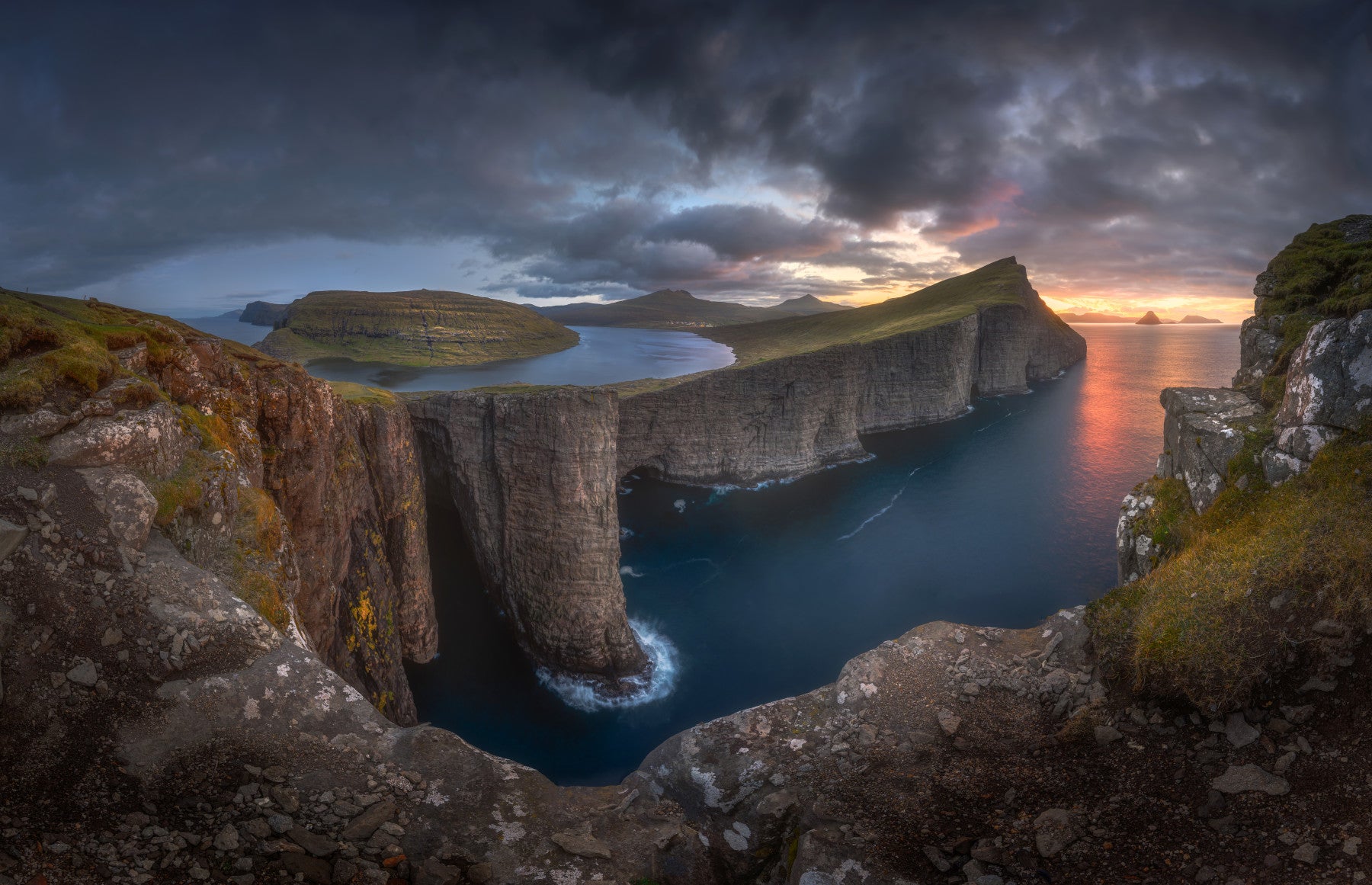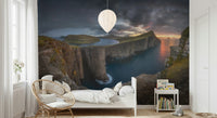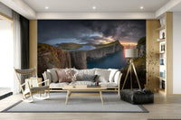 Capture the raw majesty of the Faroe Islands with this striking landscape. Jagged cliffs meet the ocean under a dramatic sky ablaze with dawn's first light. The blue water contrasts with the warm glow on the horizon, bringing nature's power to your walls. This wallpaper for walls transforms any room into a scenic vista. It particularly enhances a living room or study with a nature-inspired design. The stark beauty will complement various interiors, bringing a touch of the wild indoors.