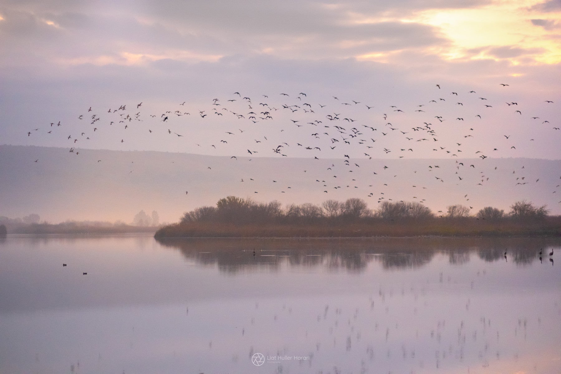 Bring the serenity of a twilight landscape indoors with this stunning wallpaper for walls. Witness a flock of birds take flight over a tranquil lake, mirrored by the soft light of the setting sun. The muted palette of purples, pinks, and browns creates a soothing atmosphere, making it a perfect choice for bedrooms or living areas. It introduces a serene ambiance and enhances a space with natural beauty. The delicate details offer a calming backdrop and complements various design styles.