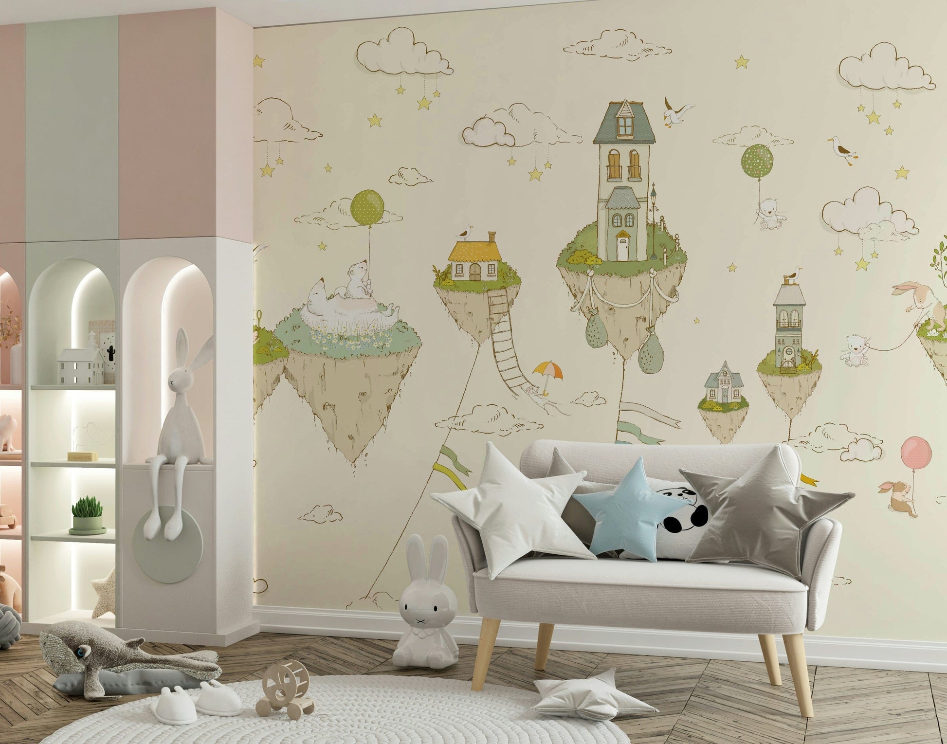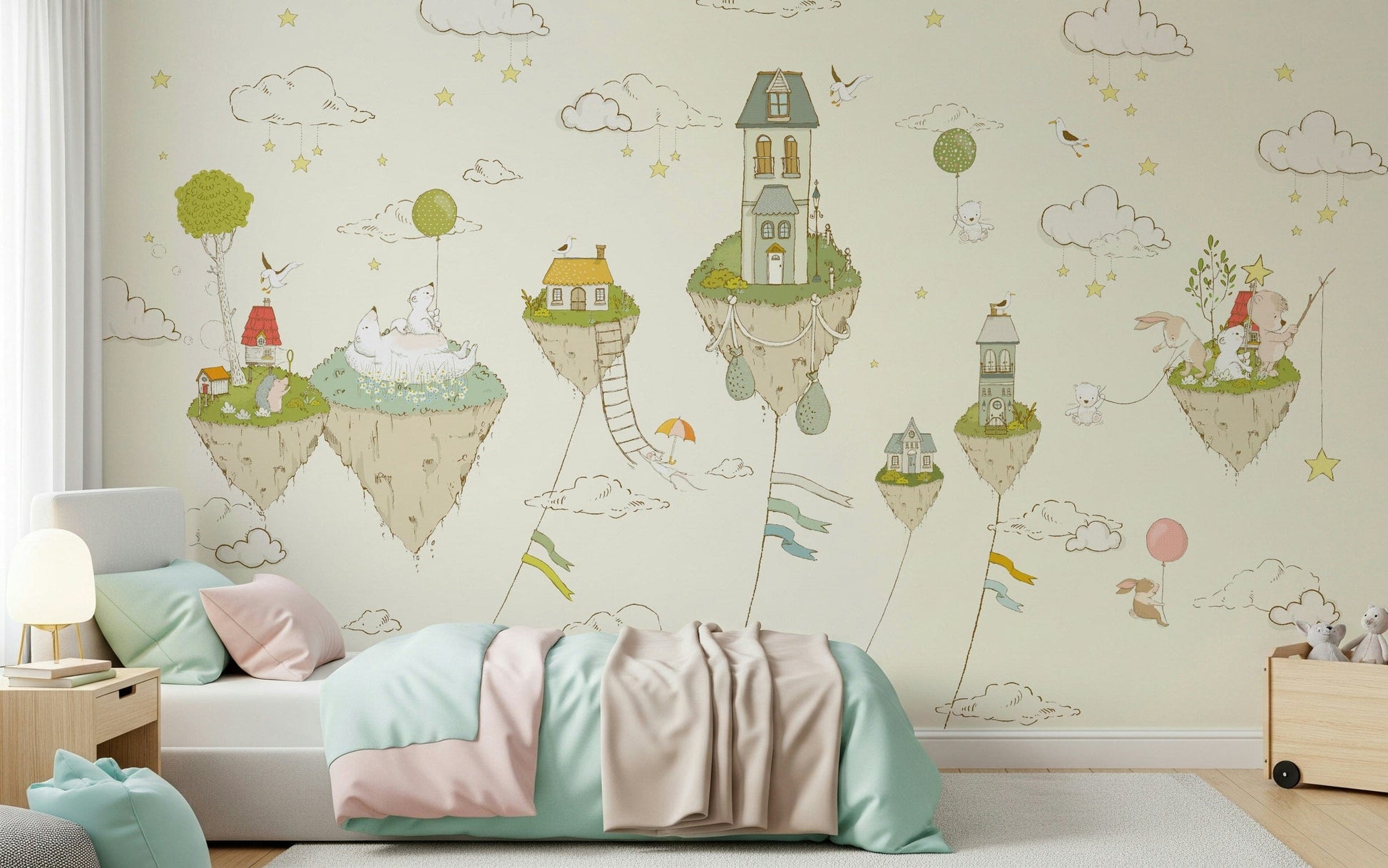 Step into a whimsical world with this charming wallpaper for walls. The design features floating islands topped with quaint houses, fluffy clouds, and adorable animals. Soft beige tones create a serene atmosphere. Ideal for a nursery or kids room, this design sparks imagination and brings a touch of magic. The neutral palette allows it to easily complement any decor, creating a playful and inviting space.