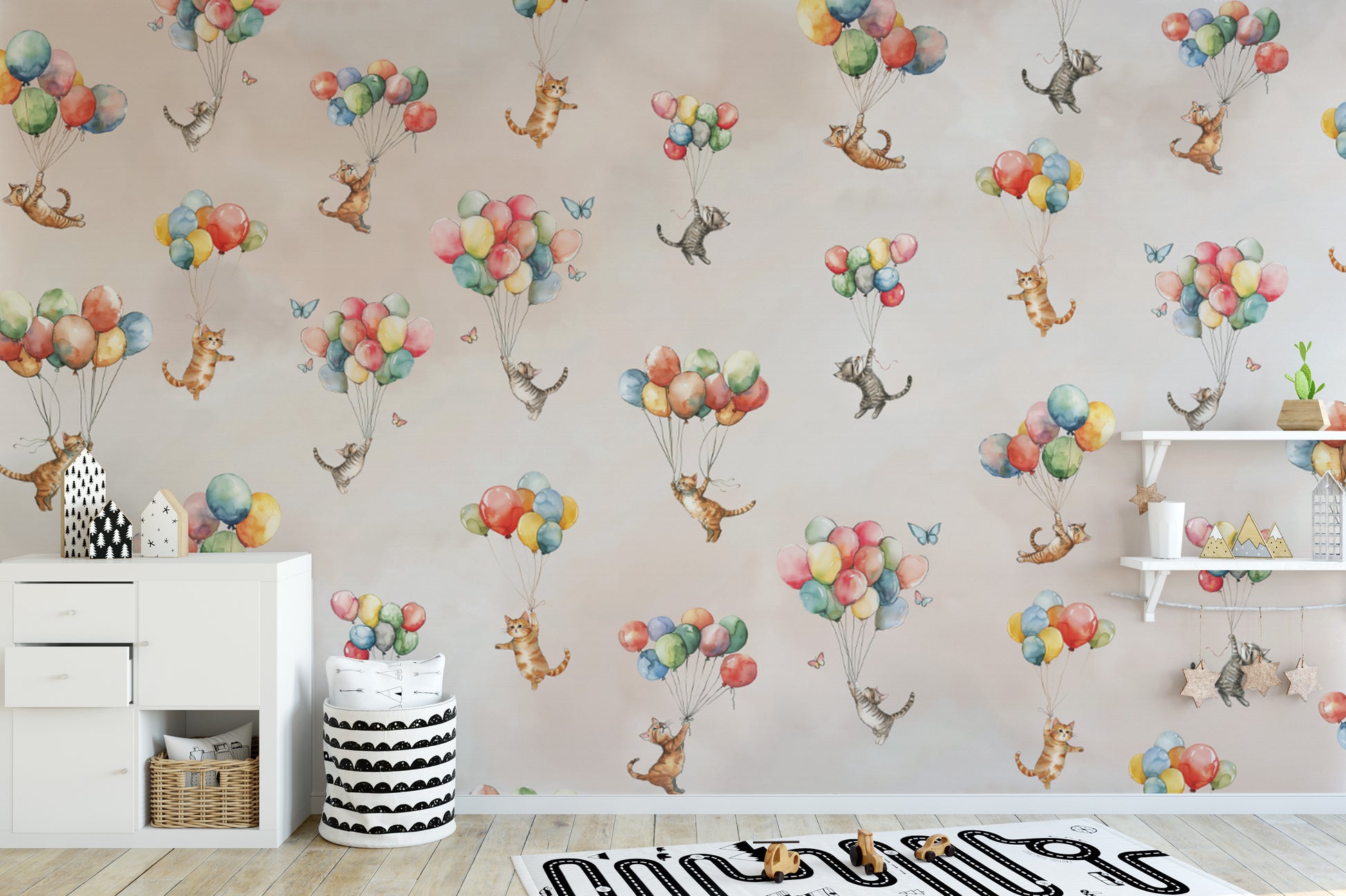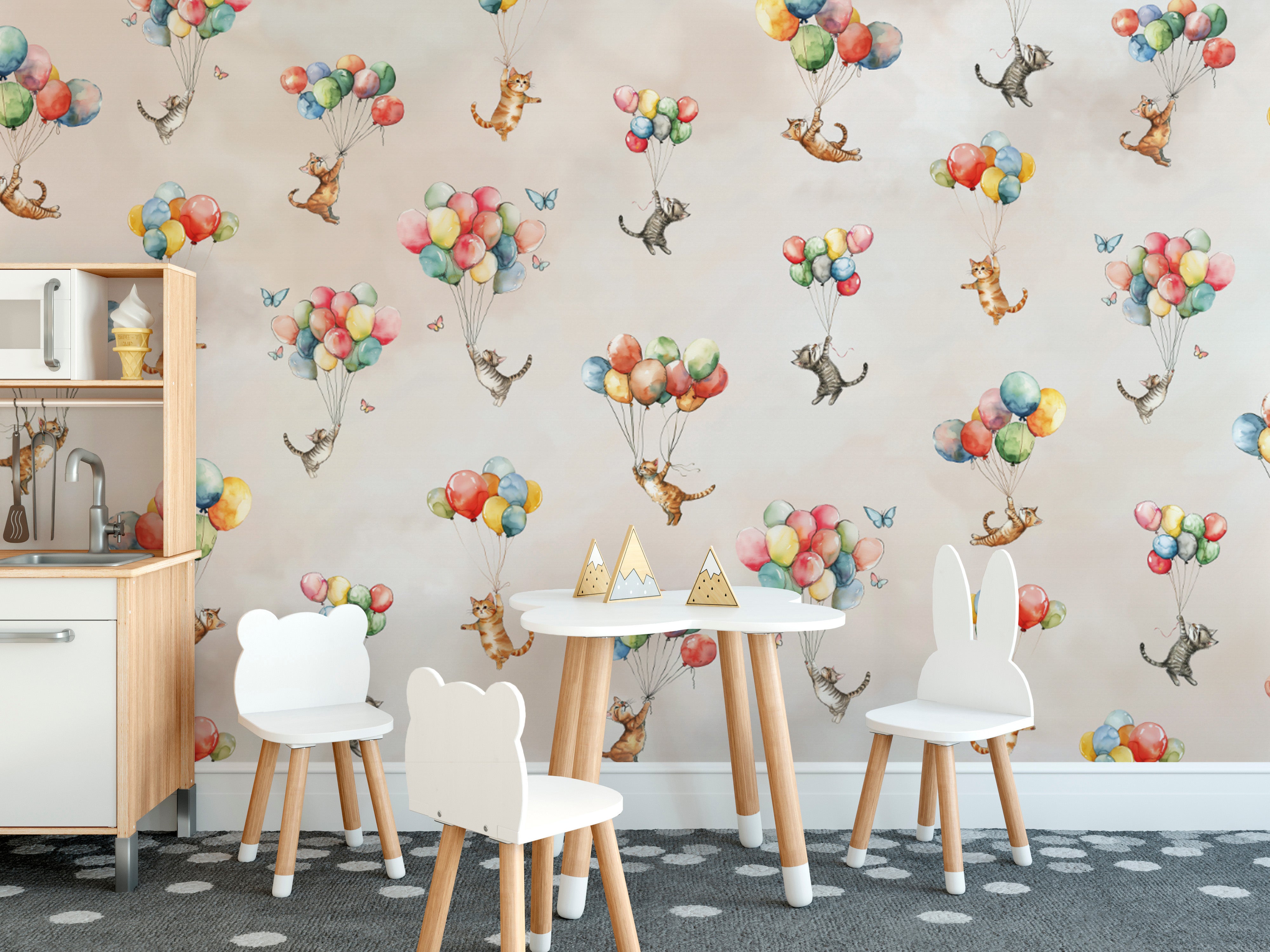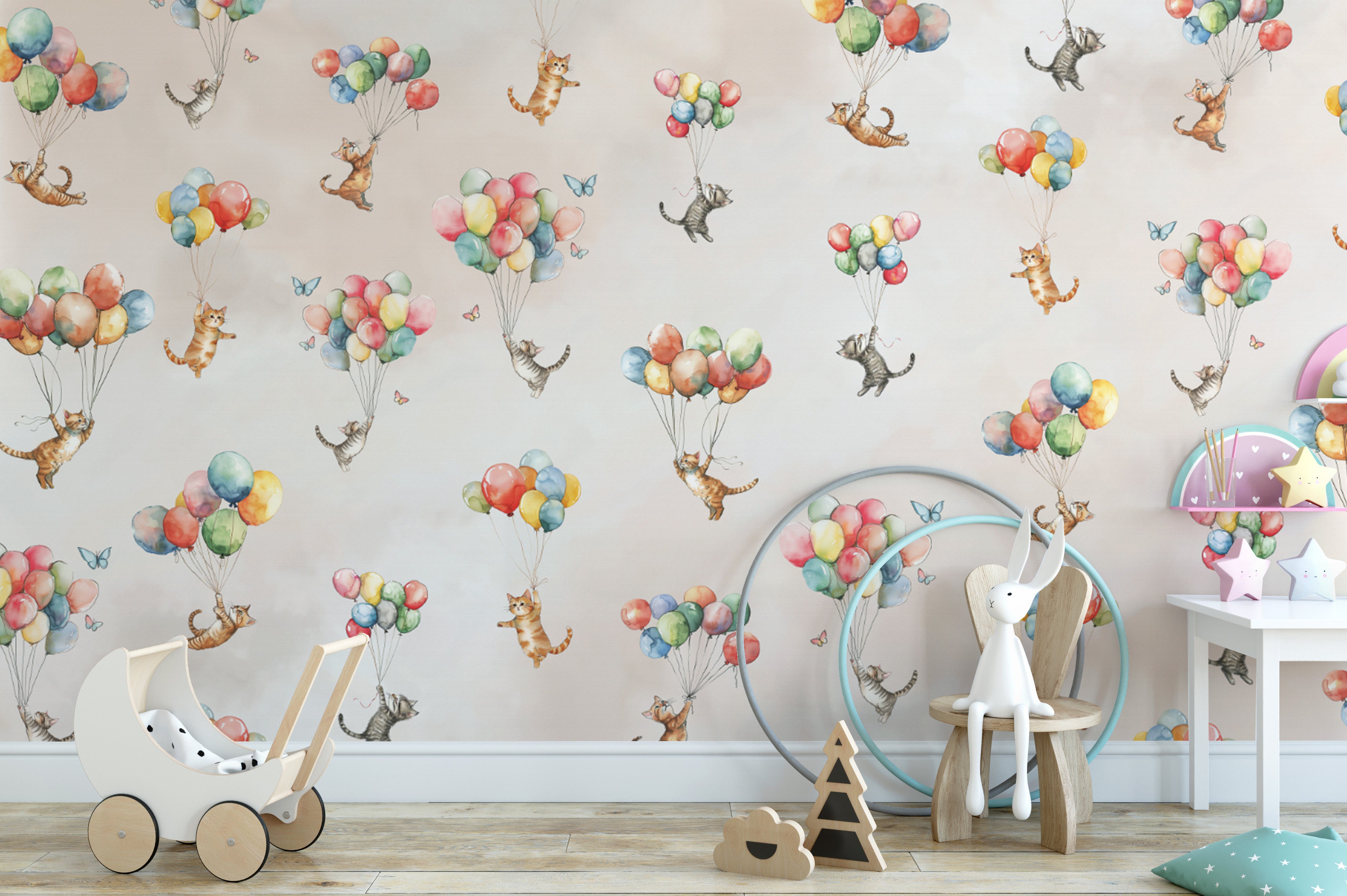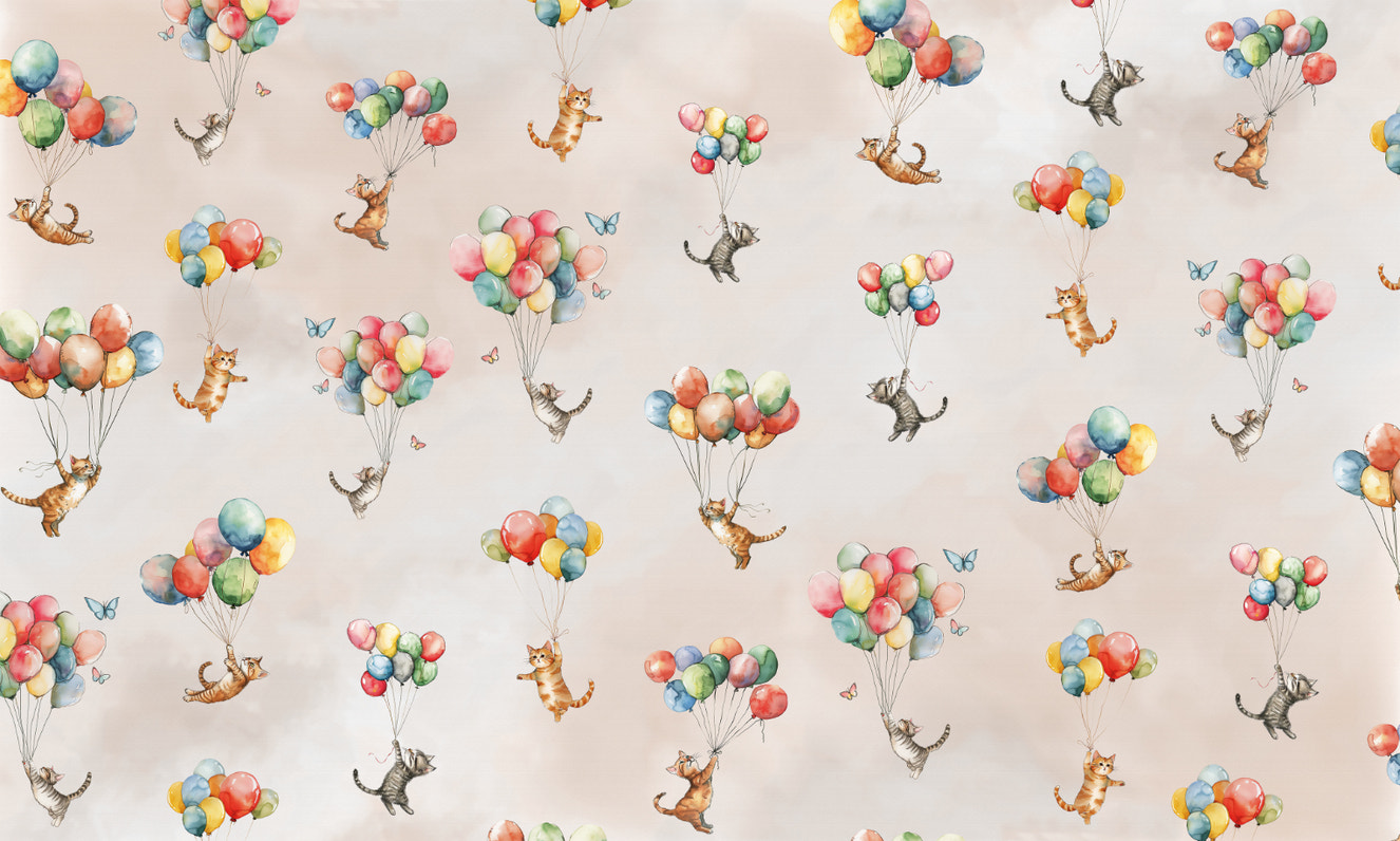 Open the door to a whimsical wonderland with floating feline fantasy wallpaper! This charming design features delightful kittens drifting above the earth on colorful balloons. Watercolorsin soft hues give it a dreamy storybook feel and make it a great pick for nurseries, playrooms, or anyone who loves cats. Designed to generate joy and imagination in the home, this wallpaper transforms walls into an adventure into magic. Whether you are decorating a child's room or adding a fun touch of zest to your decor, this unique design creates lightness and adventure, making every look a treat of cloud-induced merrymaking.