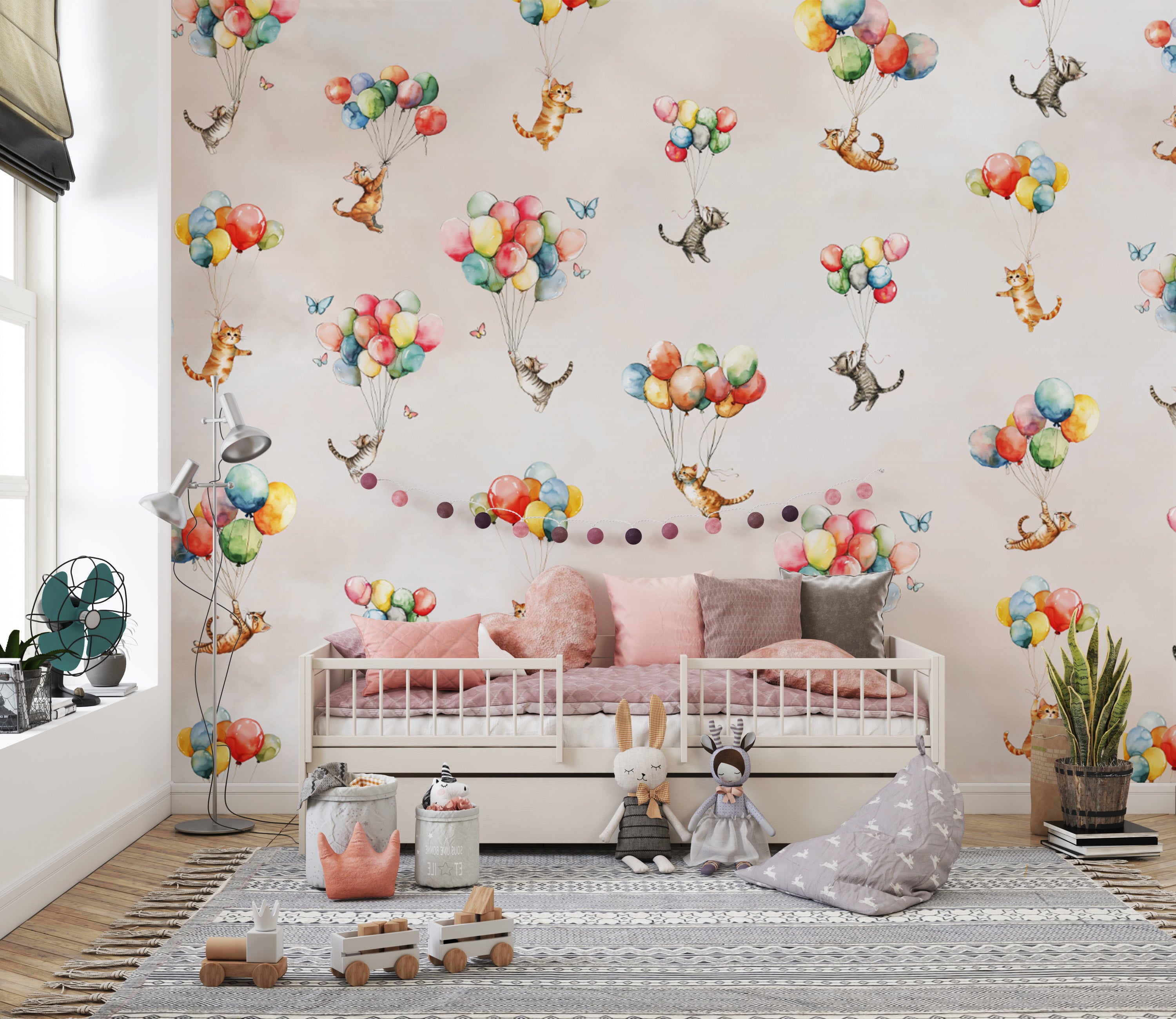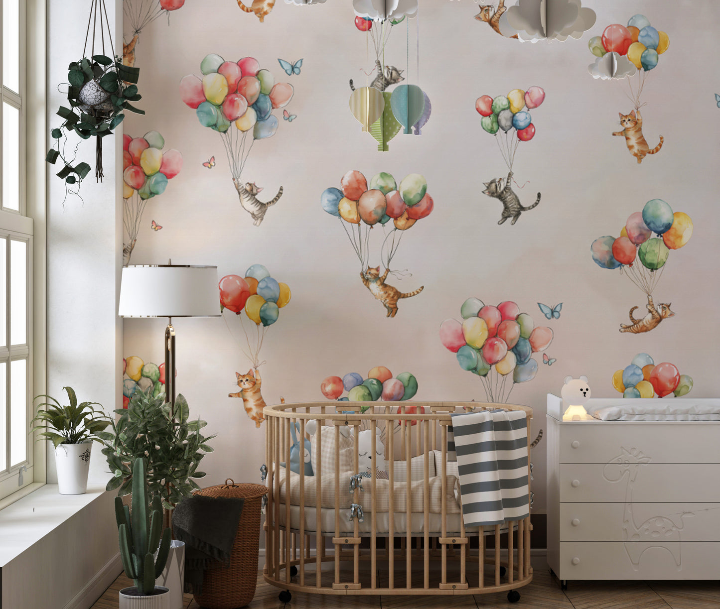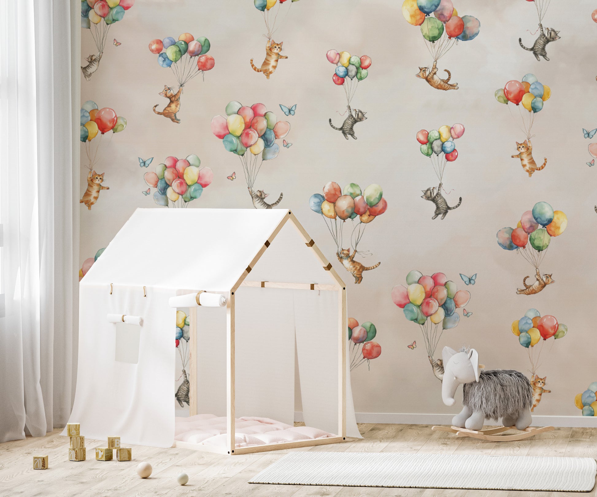 Open the door to a whimsical wonderland with floating feline fantasy wallpaper! This charming design features delightful kittens drifting above the earth on colorful balloons. Watercolorsin soft hues give it a dreamy storybook feel and make it a great pick for nurseries, playrooms, or anyone who loves cats. Designed to generate joy and imagination in the home, this wallpaper transforms walls into an adventure into magic. Whether you are decorating a child's room or adding a fun touch of zest to your decor, this unique design creates lightness and adventure, making every look a treat of cloud-induced merrymaking.