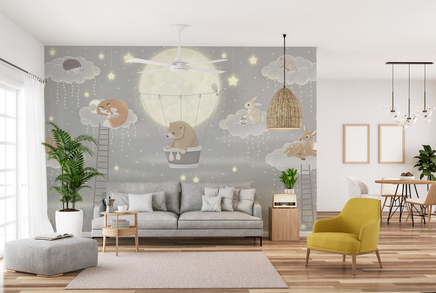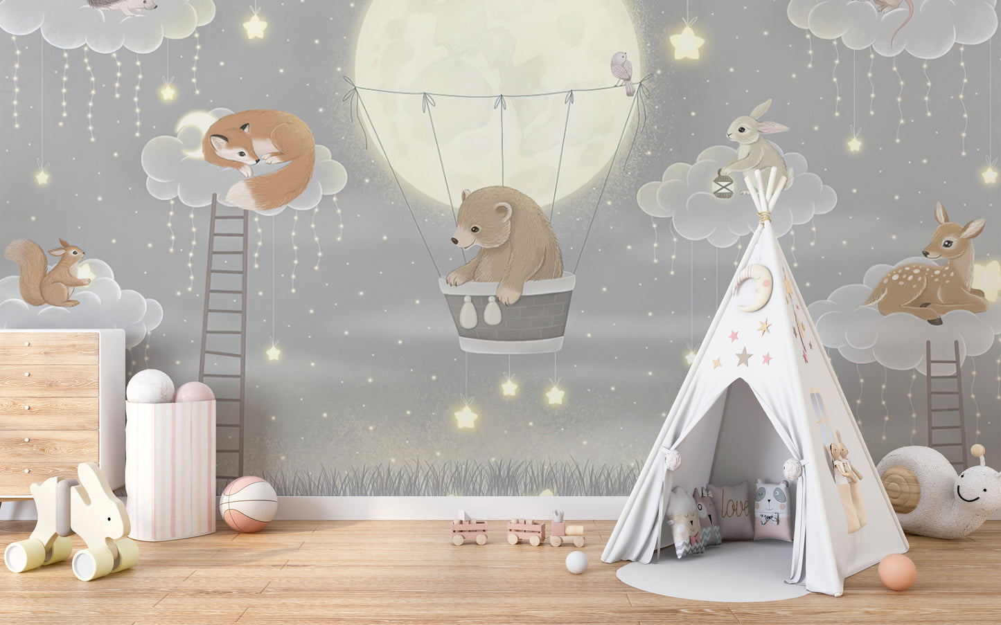Delight in the enchanting world of our floating forest friends fresco mural wallpaper, tailor-made for your little one's nursery. Transport your child to a whimsical woodland where friendly creatures glide gracefully amidst lush treetops. Crafted with the modern nursery in mind, this nursery wallpaper for kids room boasts vibrant colors and intricate designs that not only spark imagination but also create a serene backdrop for treasured memories. From playful foxes to gentle deer, every forest friend is represented, bringing joy and wonder to every glance. Experience the magic of nature combined with artistic finesse in this captivating nursery mural. Perfect for creating a nurturing environment, this wallpaper is a dreamy addition to any child's room.