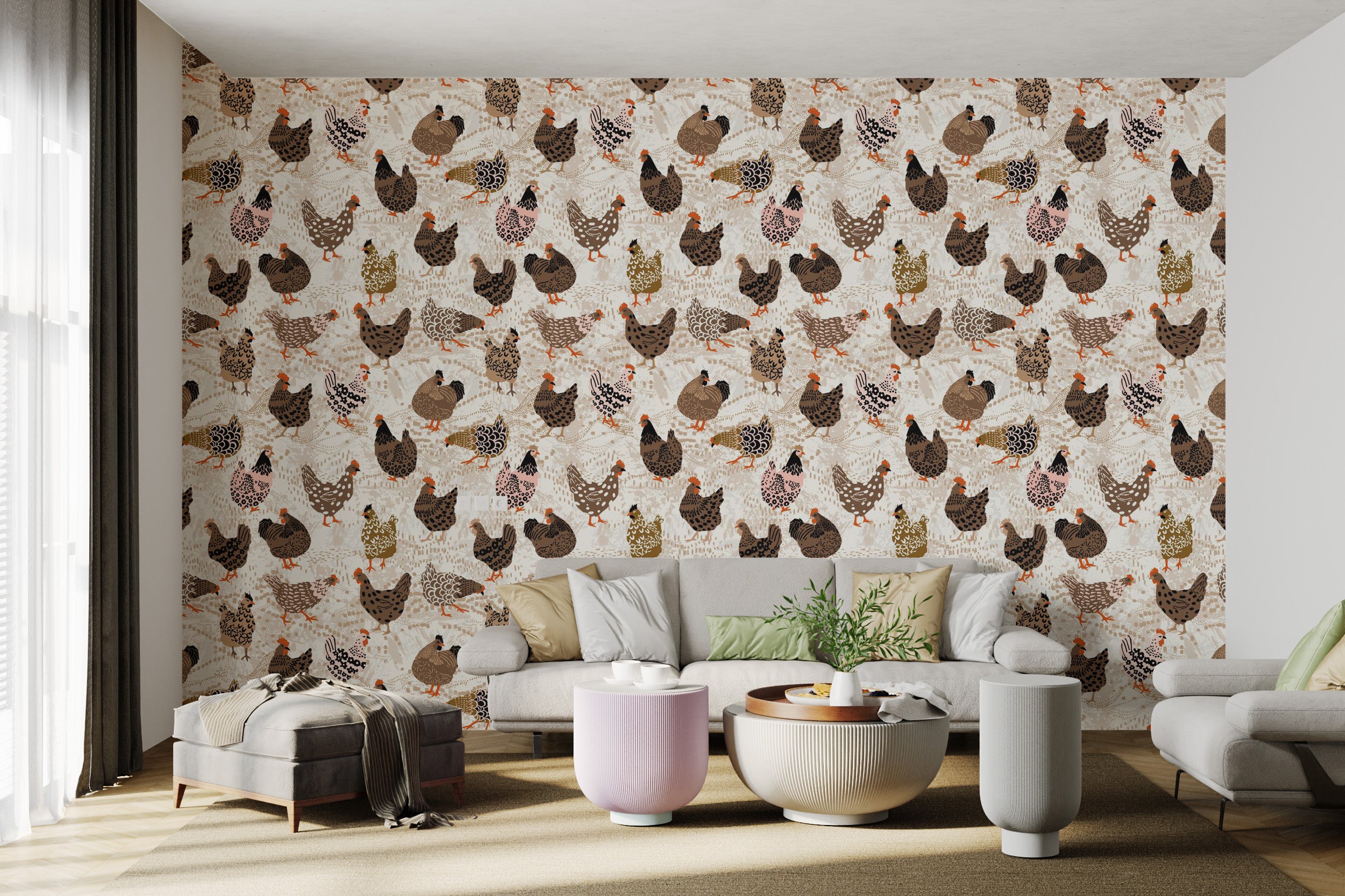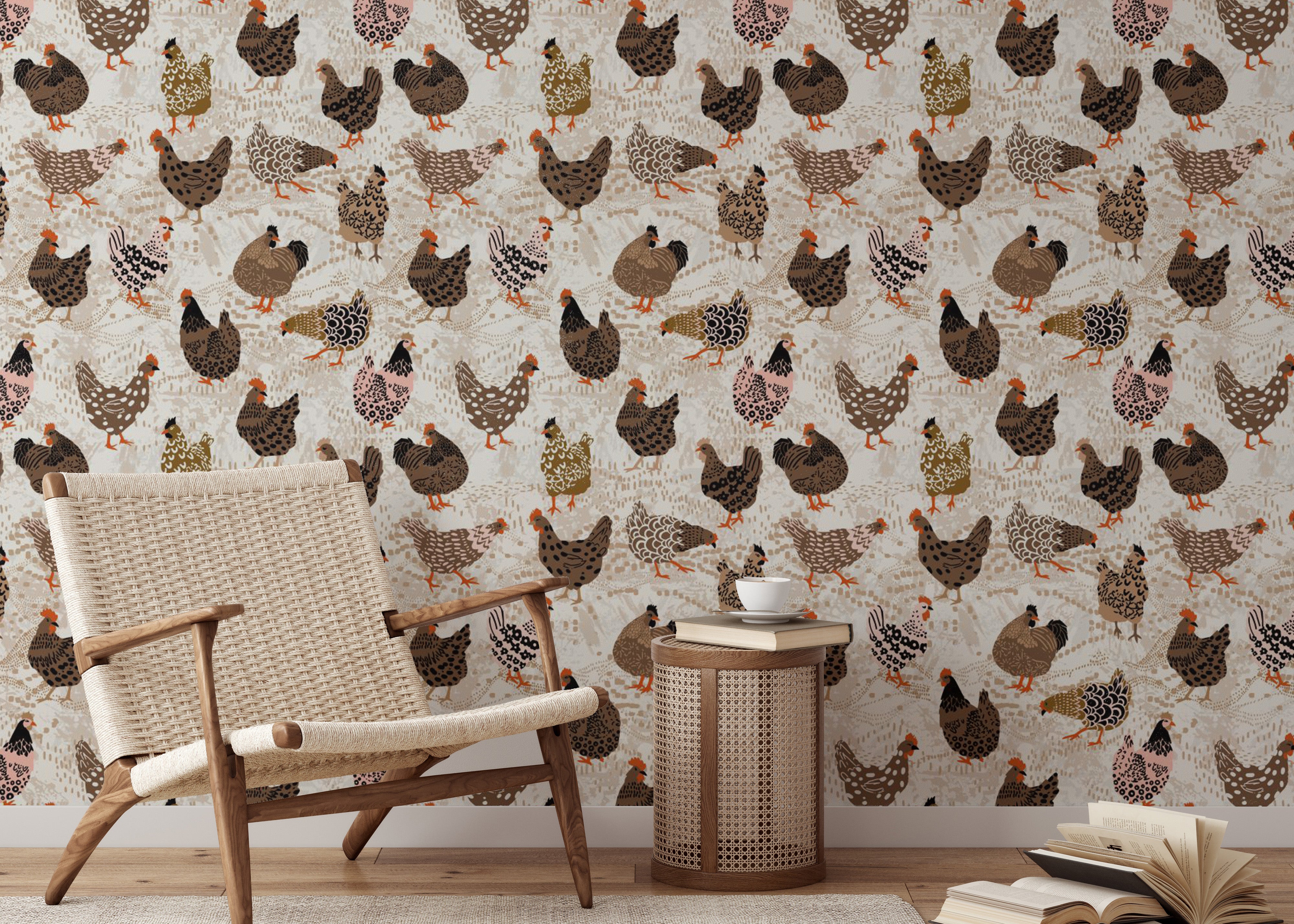 Bring whimsy to walls with the Chic wallpaper, a playful parade of poultry that promises to add a peck of personality to any room. Each pattern is a menagerie of hens strutting in style, a perfect pick for the kitchen or a cozy look. This delightful print is a conversation starter, combining rustic charm with a sprinkle of farmhouse magic. Imagine sipping morning coffee surrounded by this feathered motif, where every glance reveals a different feathered friend. It's a heartwarming twist to interior styling, creating a space that feels both homely and unexpectedly vibrant. Embrace a touch of the barnyard ballet with 'Chick Chic'!