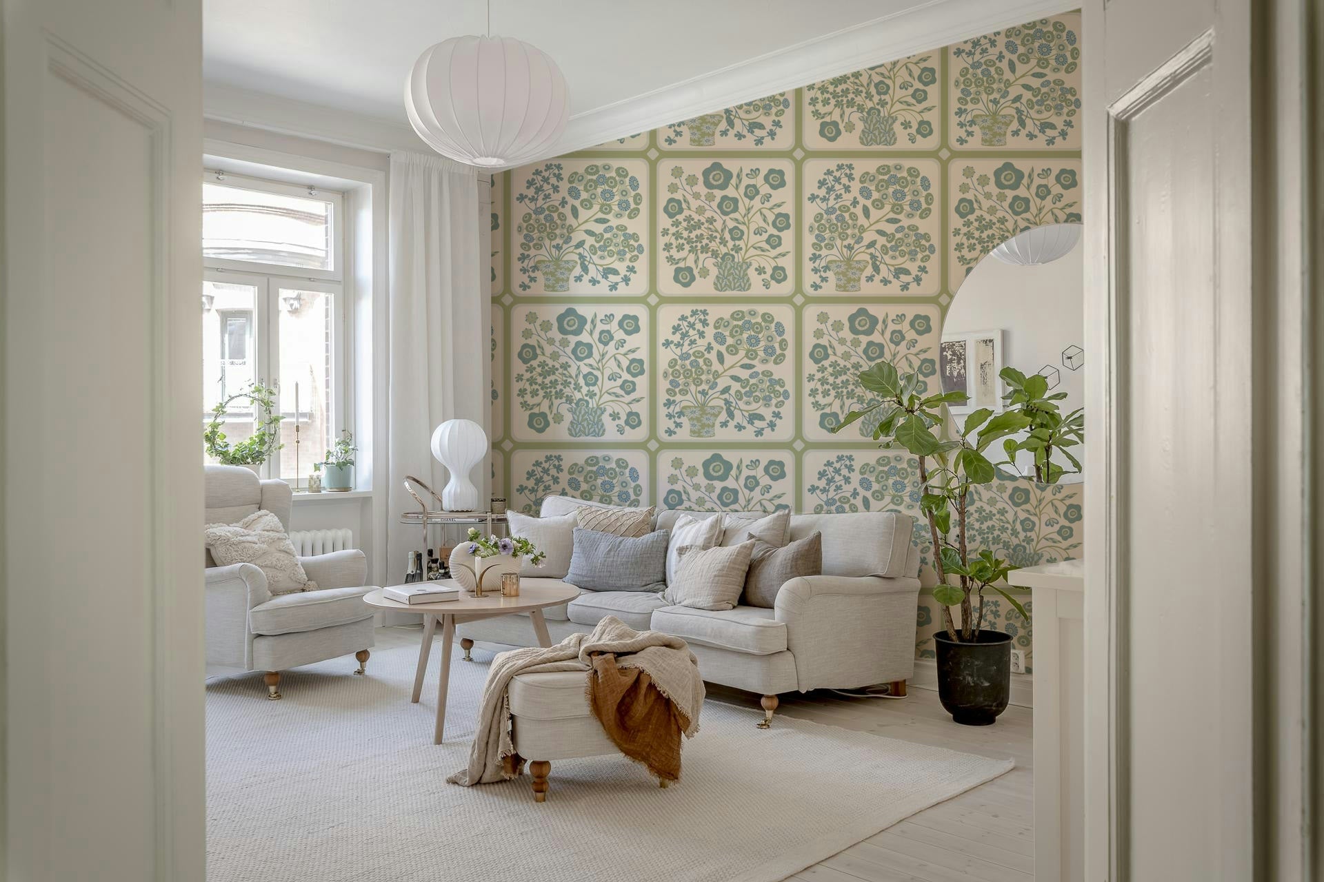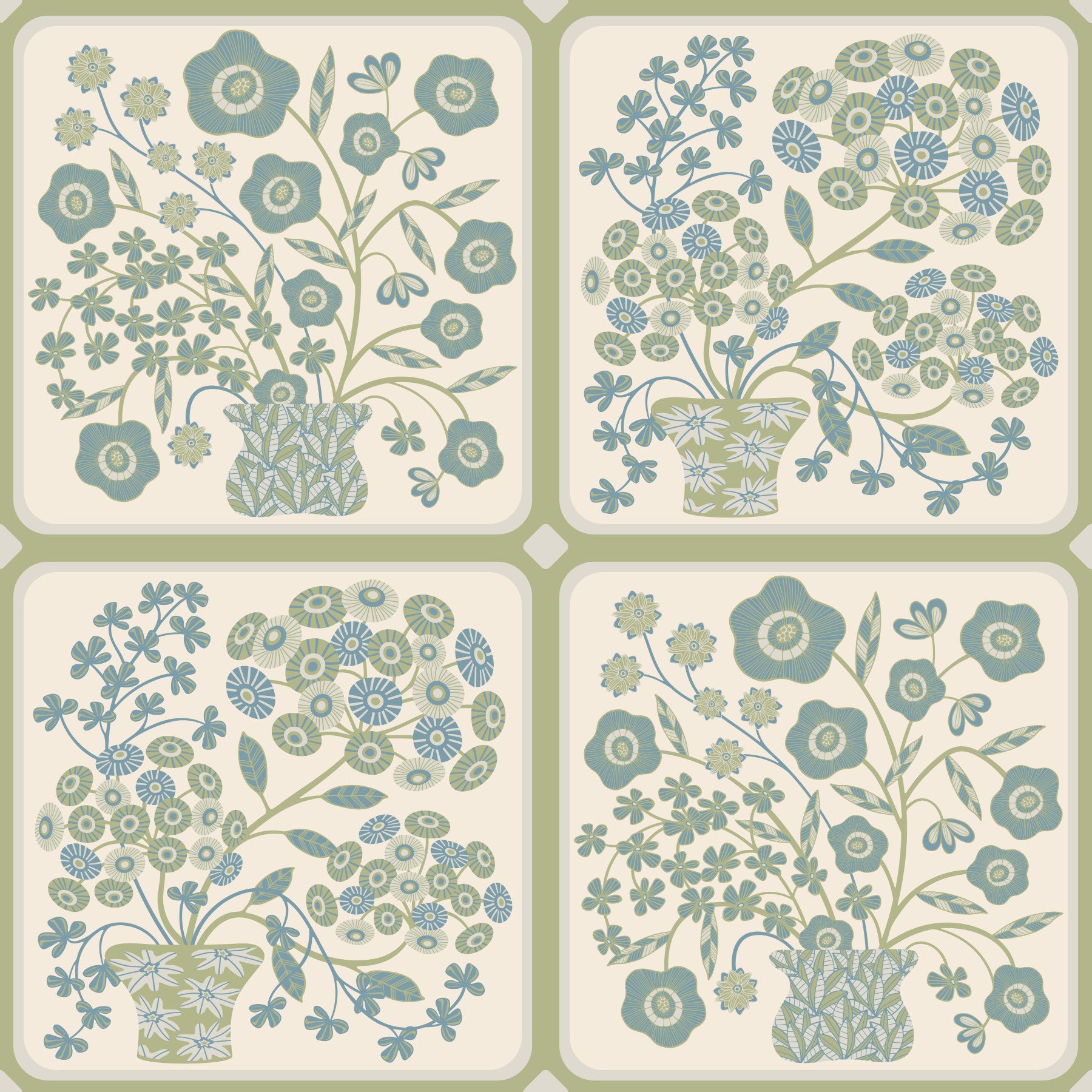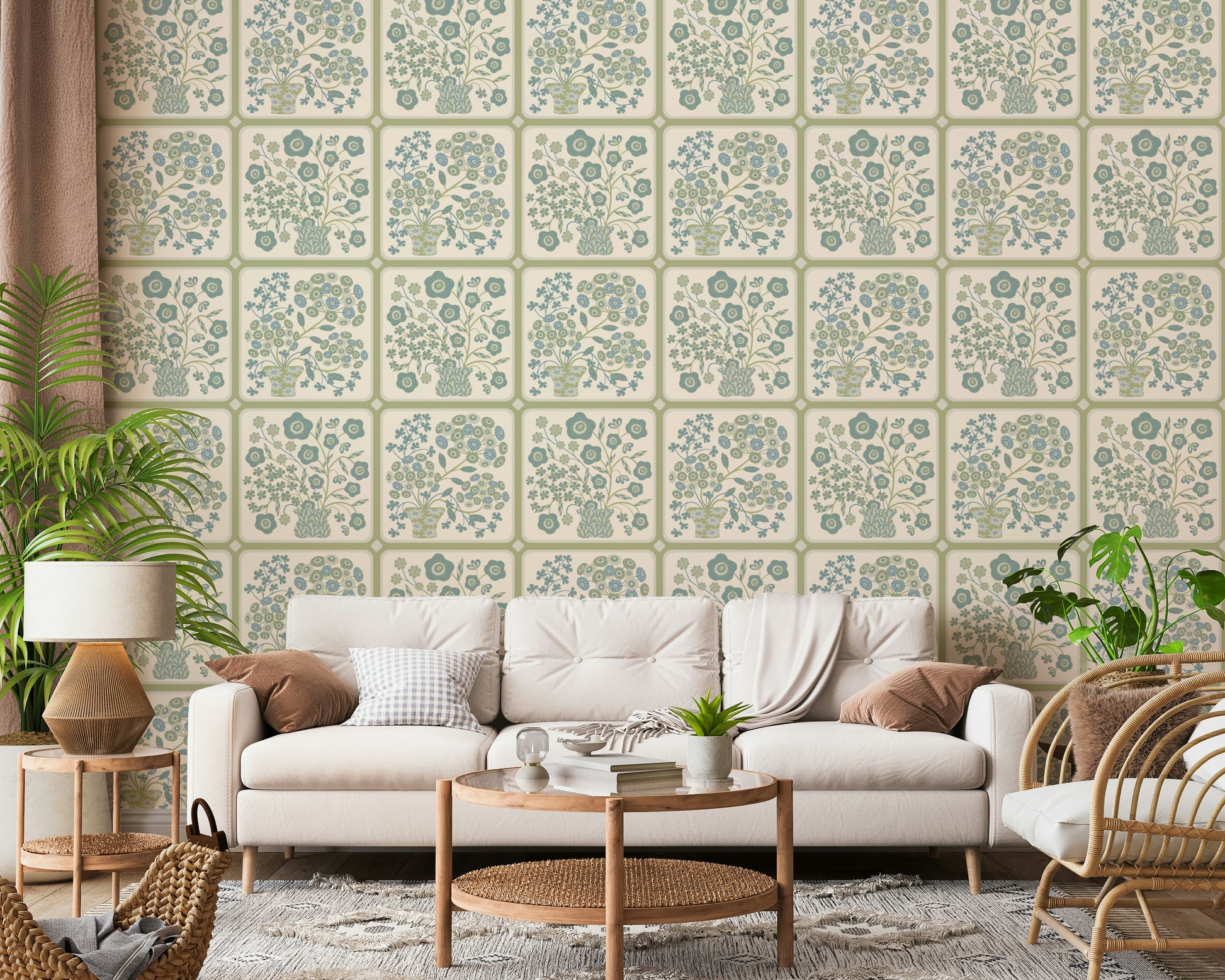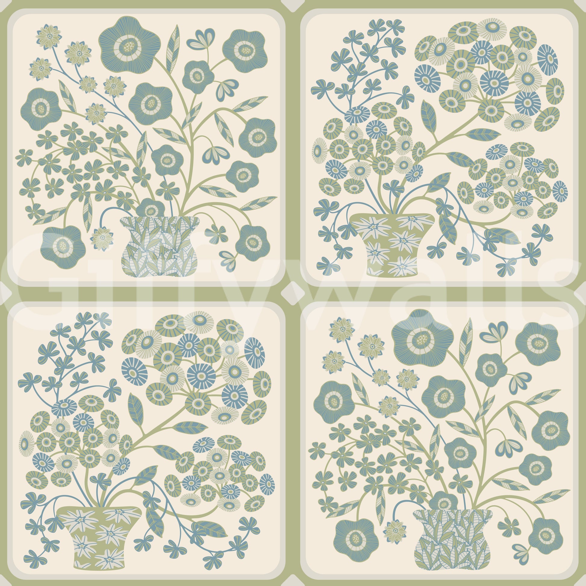 Flower Bouquet Tiles Floral Sage Green Blue Wallpaper⁠