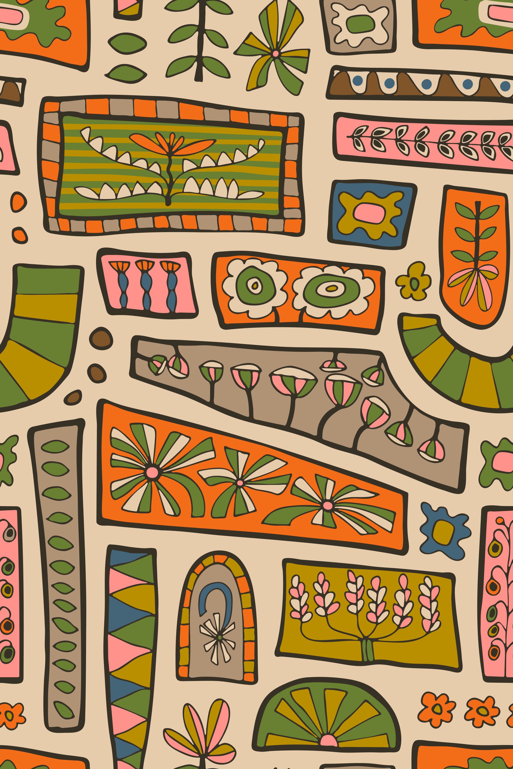 Colorful bohemian patches filled with hand-drawn flowers and plants, both sophisticated and fun! In Warm Earthy Colours: Beige, Green, Blue, Mustard Yellow, Orange, Pink and Brown on Cream. This pattern design is also available in Other Colourways too. Original wallpaper pattern design by Jackie Tahara of UnBlink Studio.