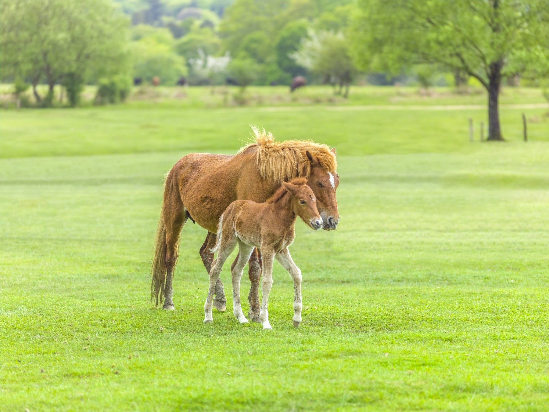 Horse with Foal. Bring a touch of the countryside inside with this charming wallpaper. It features a heartwarming scene of a mother horse and her foal exploring a lush, green pasture. The golden-brown hues of the animals beautifully complement the vibrant green backdrop. Consider this delightful wallpaper for walls in a nursery, bedroom, or living room to create a calm and inviting atmosphere. The peaceful subject matter makes it a wonderful addition to spaces where relaxation is key.