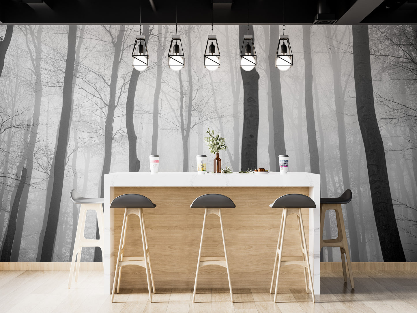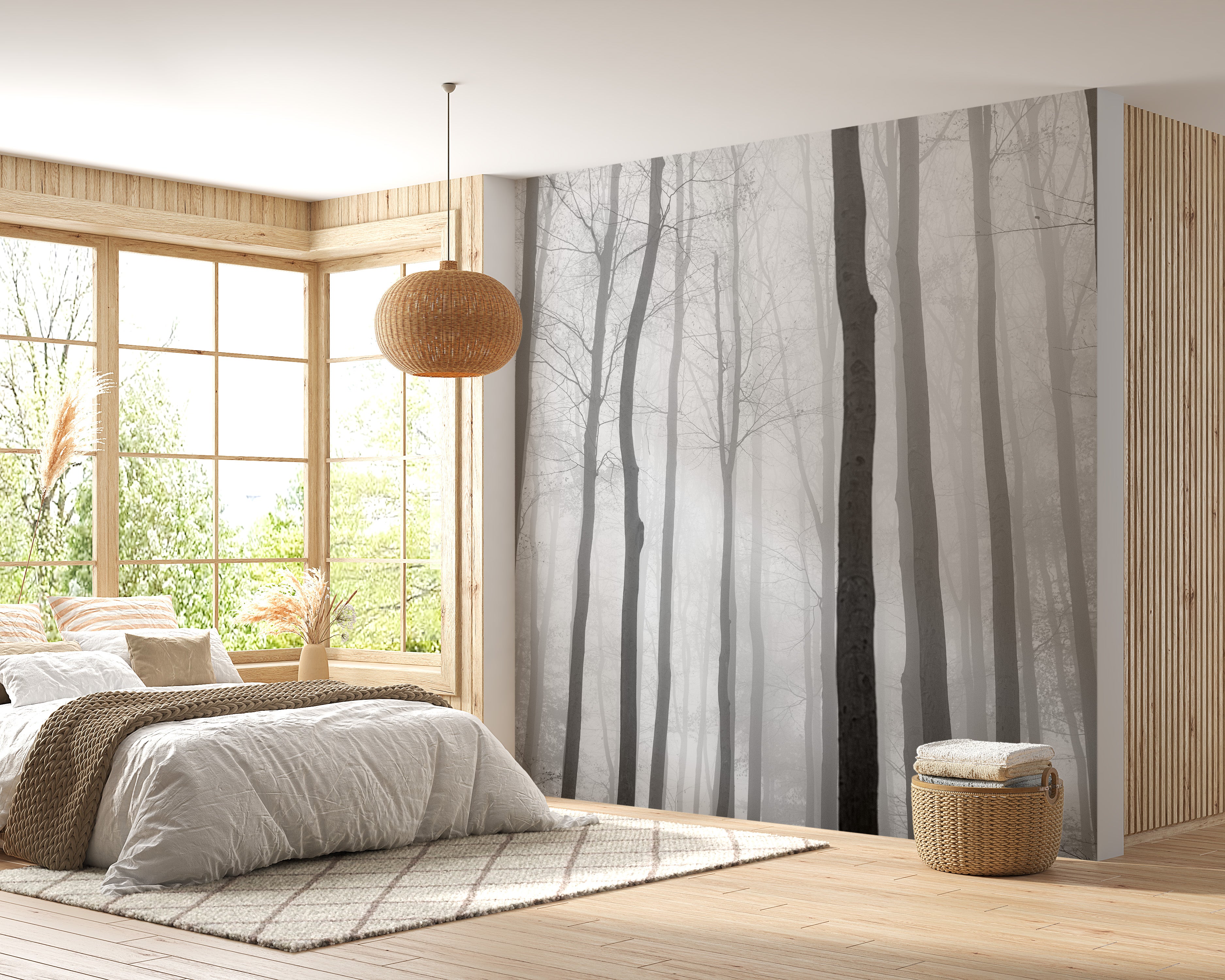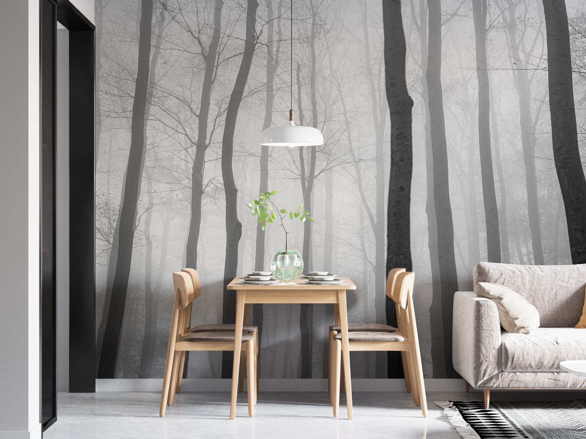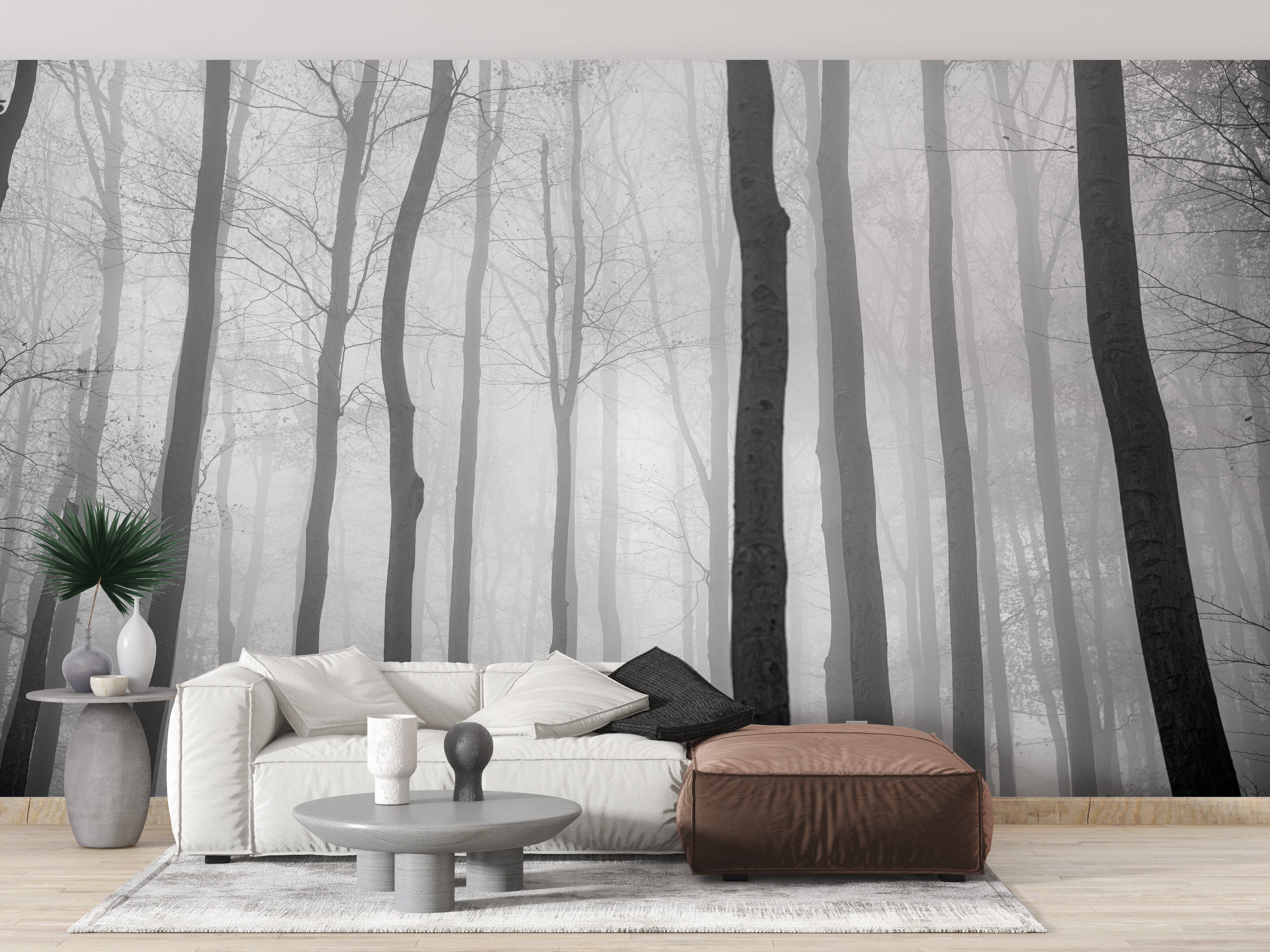 The handmade foggy day jungle wallpaper mural is durable, gorgeous, and easy to apply. Our painting is elegant and terrifying, great for a monochromatic spooky tree wallpaper bedroom or a stunning living space. With creepy tree silhouette wallpaper, foggy wood Halloween decor is spooky. Foggy Day jungle wallpaper mural brings nature's dark side within for a strange, tranquil escape.