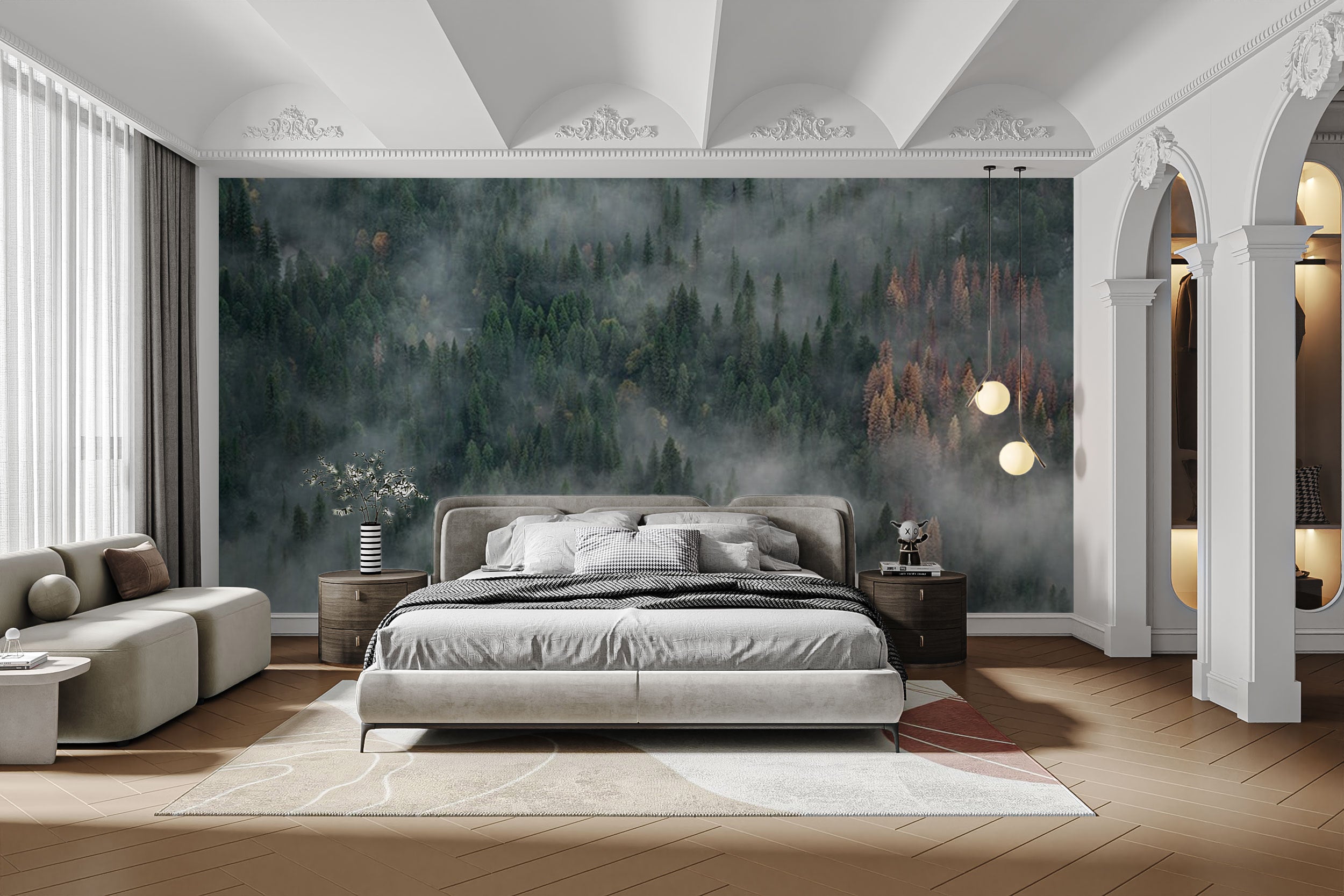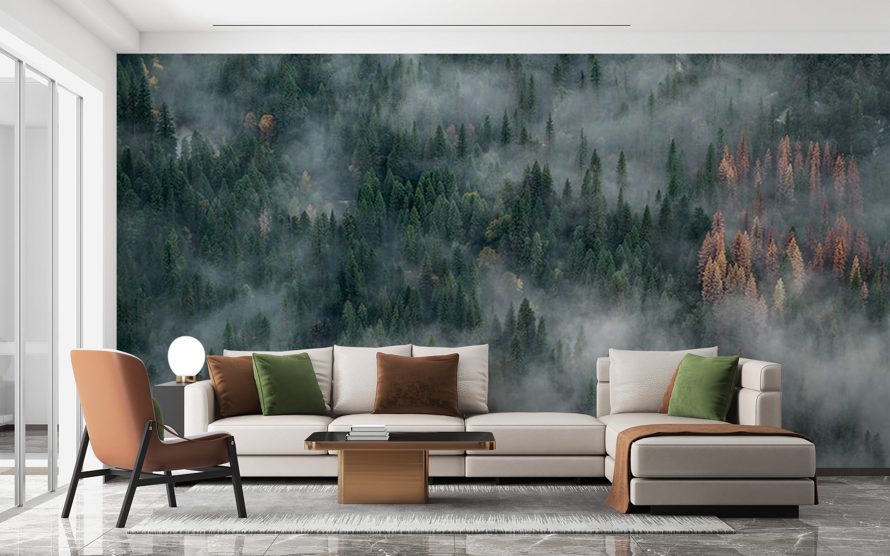 Our beautiful foggy pine forest wallpaper mural presents stillness and beauty of nature. It use shades of deep green and mild whiteness together to recreate a magical look for foggy jungle. Living room theme: nature tall pine tree branches are the epitome of nature with its precision too accurate to be ignored, creating an ambience that makes you feel right where in a forested area and taking deep breaths of fresh crisp air. Well, as for us, we make this wall green with the upmost resolution and detailing that proves our quality servicing along with being aesthetically pleasing.  Its soft, misty glow enchants and tranquilizes any room it touches. The serene mural for your office coffee corner or peaceful sanctuary in the house. Discover the hug of nature and bring elegance with peace in your area using our pine forest foggy wallpaper.
