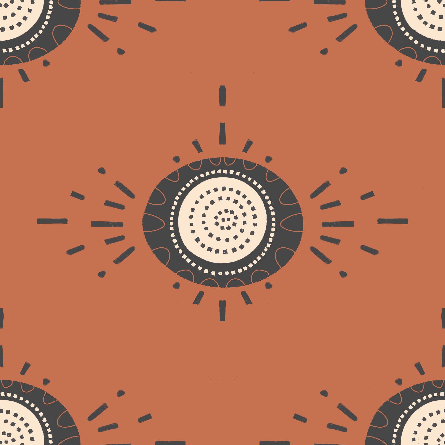 Embrace the warmth and earthy elegance of Folk Bloom a wallpaper design that seamlessly blends Scandinavian simplicity with mid-century modern charm and a touch of folk-inspired floral abstraction. The light charcoal and terracotta palette creates a soothing, inviting atmosphere, reminiscent of sun-baked clay and cozy hearths. Abstracted floral motifs, rendered in clean, geometric shapes, evoke a sense of natural beauty while maintaining a minimalist aesthetic. The design features stylized blooms surrounded by radiating dashes and subtle curves, creating a balanced and harmonious visual rhythm. "Folk Bloom" is perfect for adding a touch of understated sophistication and organic warmth to any room, from living areas to bedrooms, infusing your space with a sense of calm and grounded beauty. Let this design be a canvas for a home that speaks to the heart.