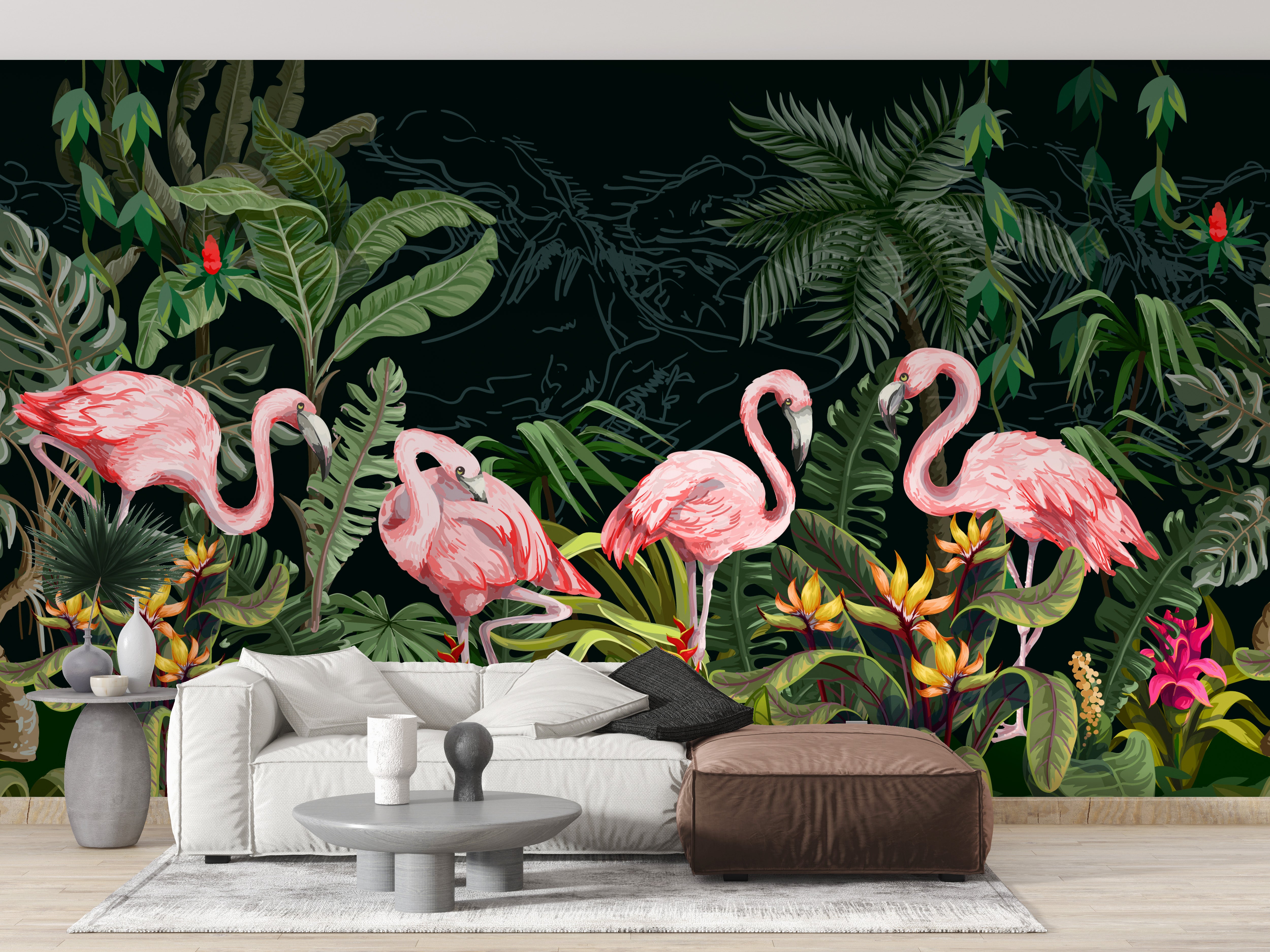 Elegant Dark Forest Flamingo Wall Mural for Living Room