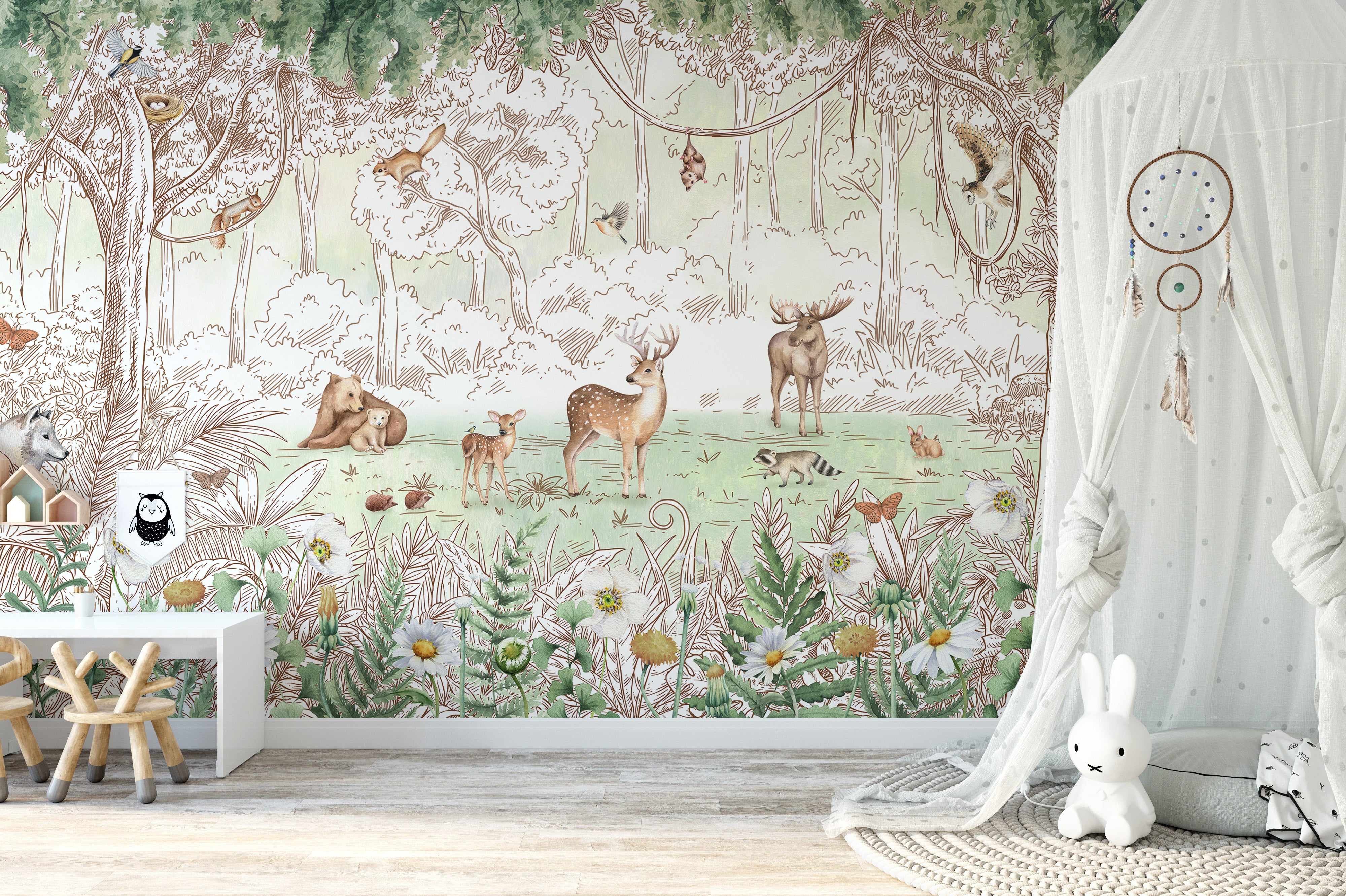 Welcome the renewal of spring with the Forest Friends in Spring Season Wallpaper. This delightful mural brings the freshness and vibrancy of spring to your walls, featuring forest animals frolicking among blooming flowers. The lively colors and playful scenes capture the essence of the season, making any room feel brighter and more inviting. Perfect for those looking to refresh their space with the joy and energy of spring, this forest wallpaper adds a touch of nature's beauty and the spirit of new beginnings. Let the forest friends usher in the season of renewal and growth into your home.