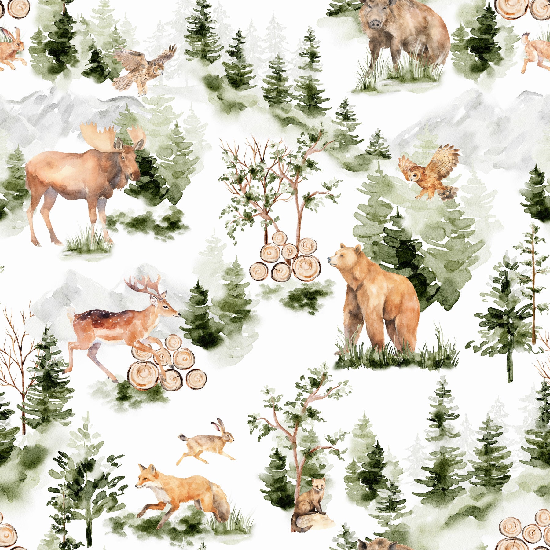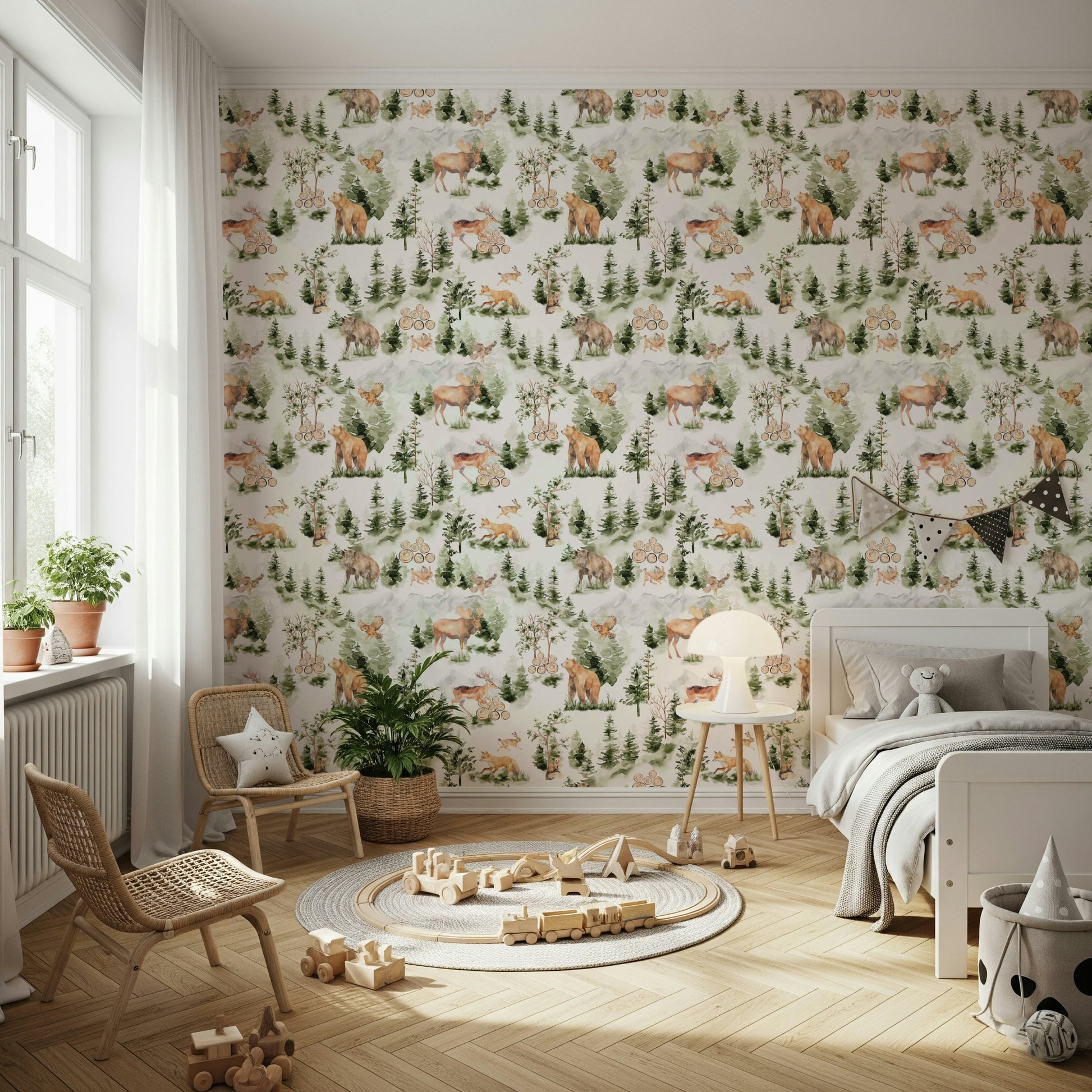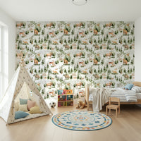 Invite nature's charm into your home with this delightful forest animal wallpaper by Uta Naumann. A collection of bears, foxes, moose, rabbits and owls mix between trees and mountains in a brushstroke design creating an enchanting scene. This wallpaper for walls presents a watercolor aesthetic, giving the walls a soft, artistic appearance. It's well suited for kids' rooms, playrooms, or bedrooms. It brings a peaceful, natural element to any interior style. Decorate your spaces with this pattern that brings forest magic into everyday life.