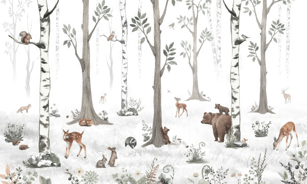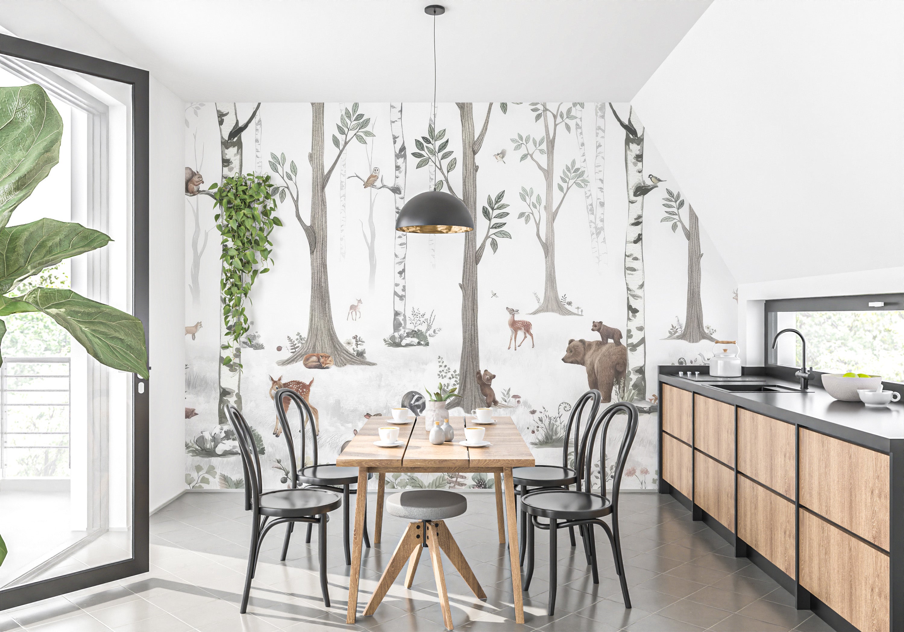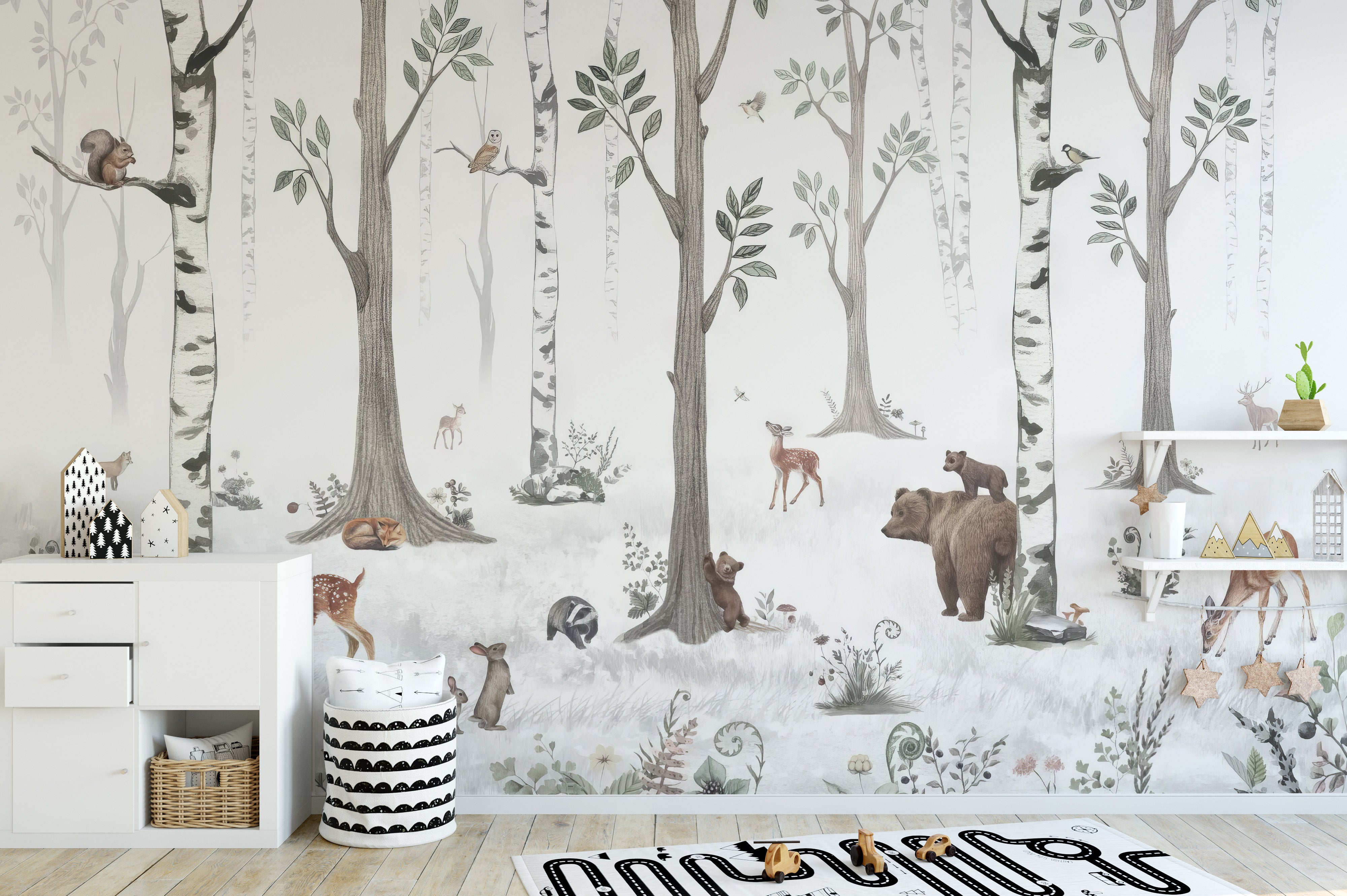 Envision a serene forest sanctuary gracing your kids room wallpaper. The forest haven wall mural presents a lush panorama, bringing a breath of the wild outdoors inside. Every glance reveals charming woodland creatures nestled among the trees, creating a soothing environment for guests and residents alike. This living room wallpaper embodies a connection to nature's quietude, inviting calmness into your abode.