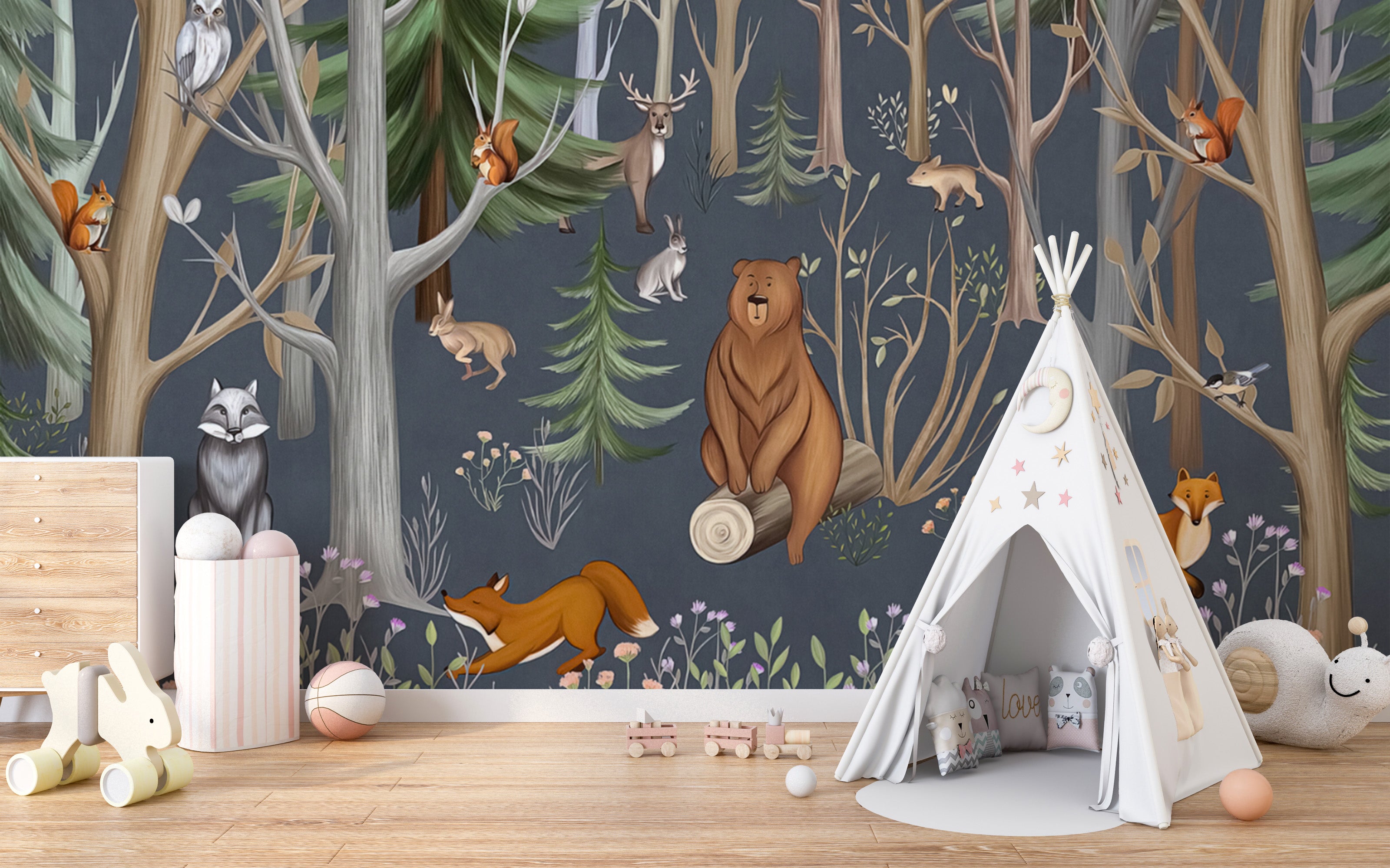 Step into a whimsical woodland with our forest quartet mural wallpaper. Perfect for transforming any child's space into a magical haven, this cartoon nursery wallpaper showcases a delightful ensemble of cartoon animals harmoniously playing together amidst the verdant forest backdrop. Each character has been intricately designed to capture the imagination of little ones, making it not just a wallpaper but a story waiting to unfold. This captivating cartoon animal wallpaper offers both style and charm, ensuring your nursery stands out with a touch of enchantment.