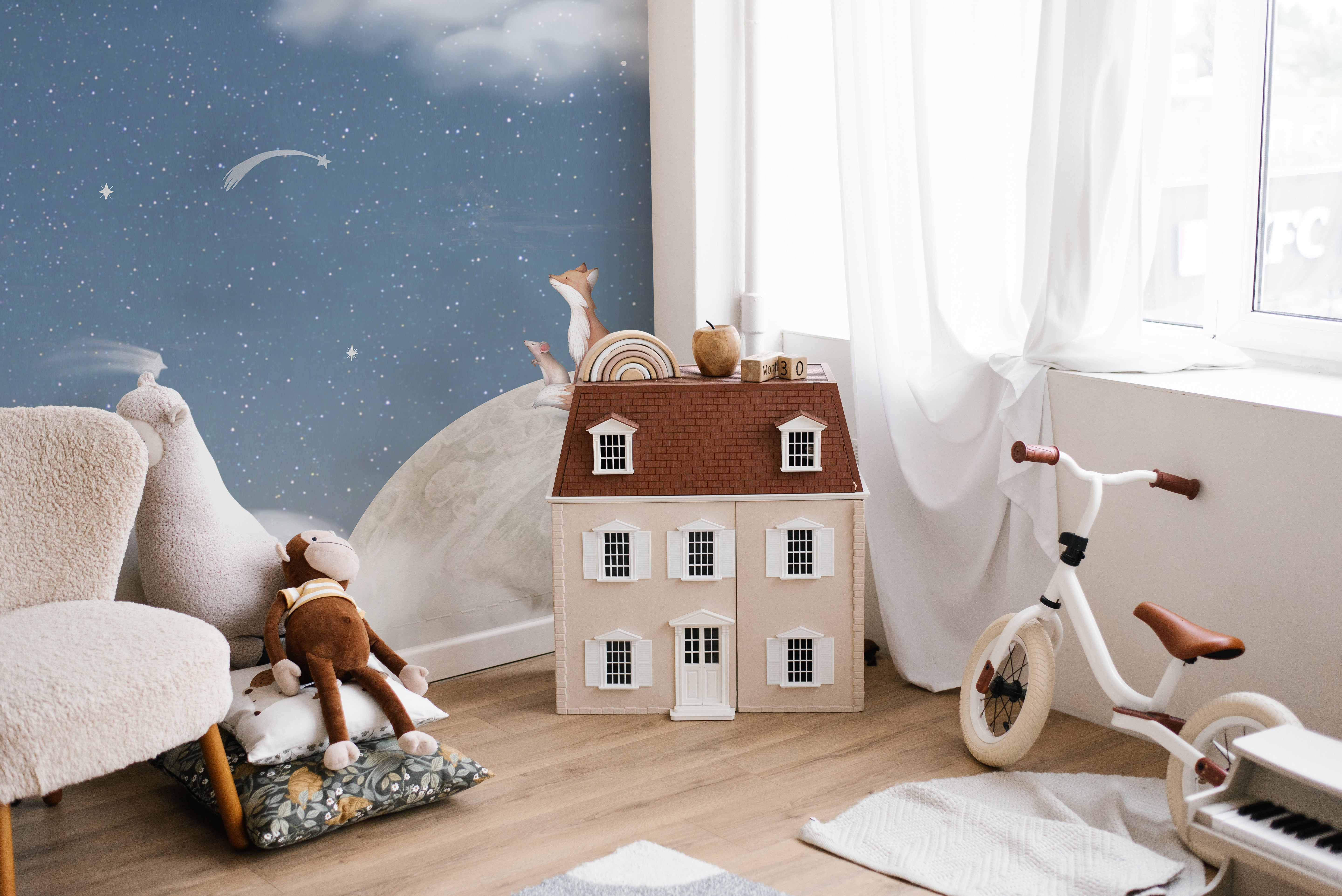 Bring a touch of whimsy to kids room using the fox on the moon blue mural. This charming wallpaper showcases a serene night sky where a curious fox sits on the moon. The mural’s soft blue hues, scattered stars, and gentle clouds create a tranquil setting, ideal for inspiring bedtime stories and dreams. Kids will love the playful design that stirs their imagination, making this mural a perfect choice for any child's room. Choose this unique wallpaper to turn kids room into a magical space filled with wonder and creativity.
