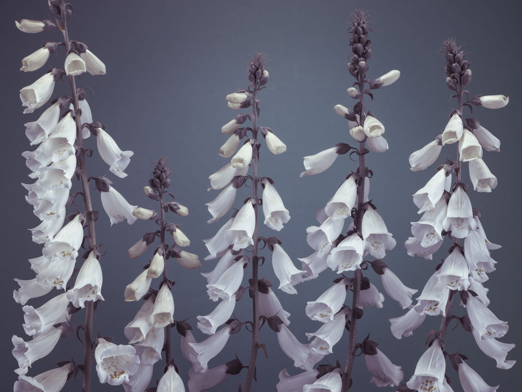 Foxglove Fantasy mural, tall white blossoms against a muted grey.