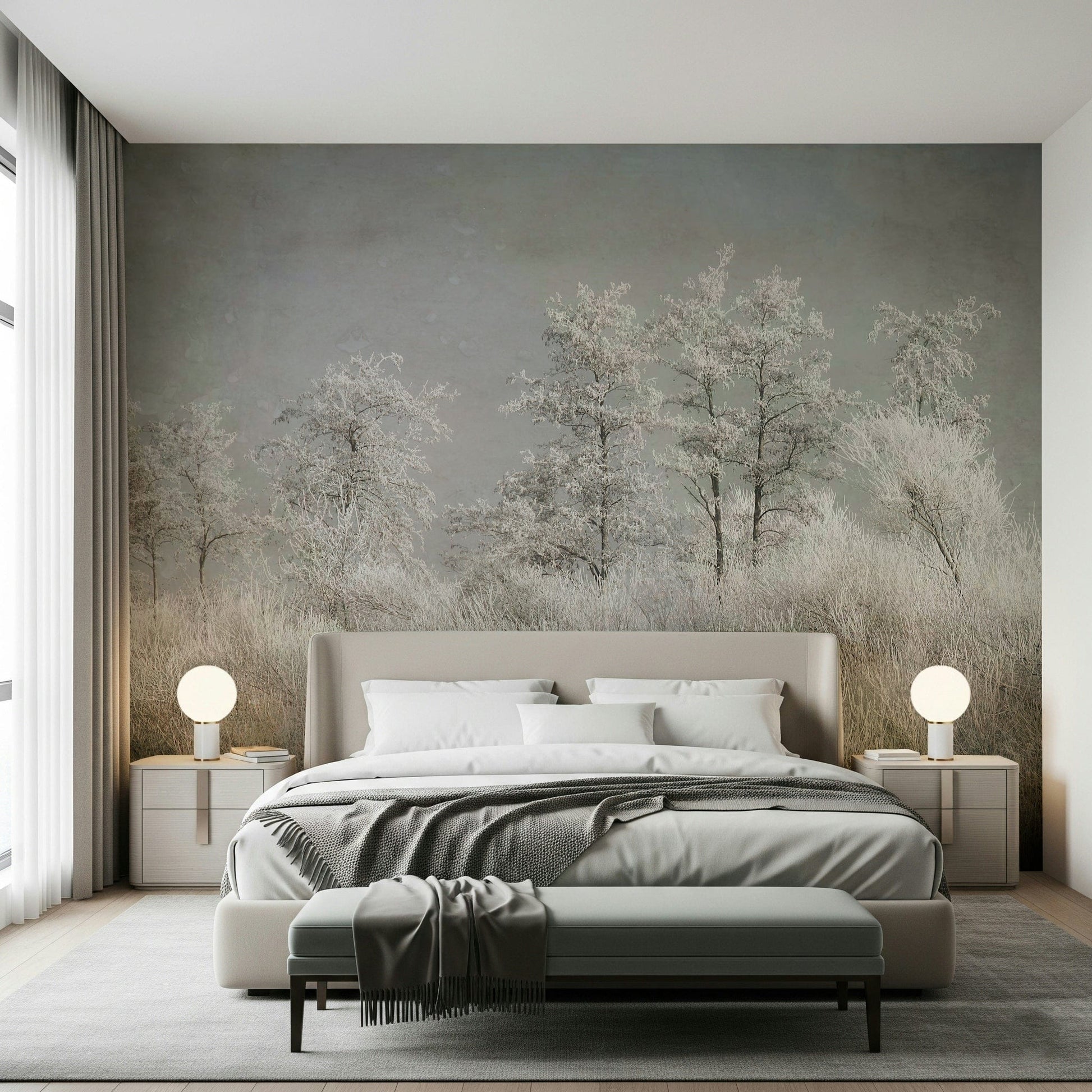 Transform your space with this serene wallpaper for walls. The design showcases a frosted landscape, where ice-covered trees and grasses create a peaceful scene. The cool, muted tones of gray, white, and beige bring a calming effect to any room. This wallpaper works wonderfully in bedrooms, living rooms, or even hallways, offering a touch of nature's quiet beauty. Let this tranquil design bring a touch of winter's stillness to your interiors.