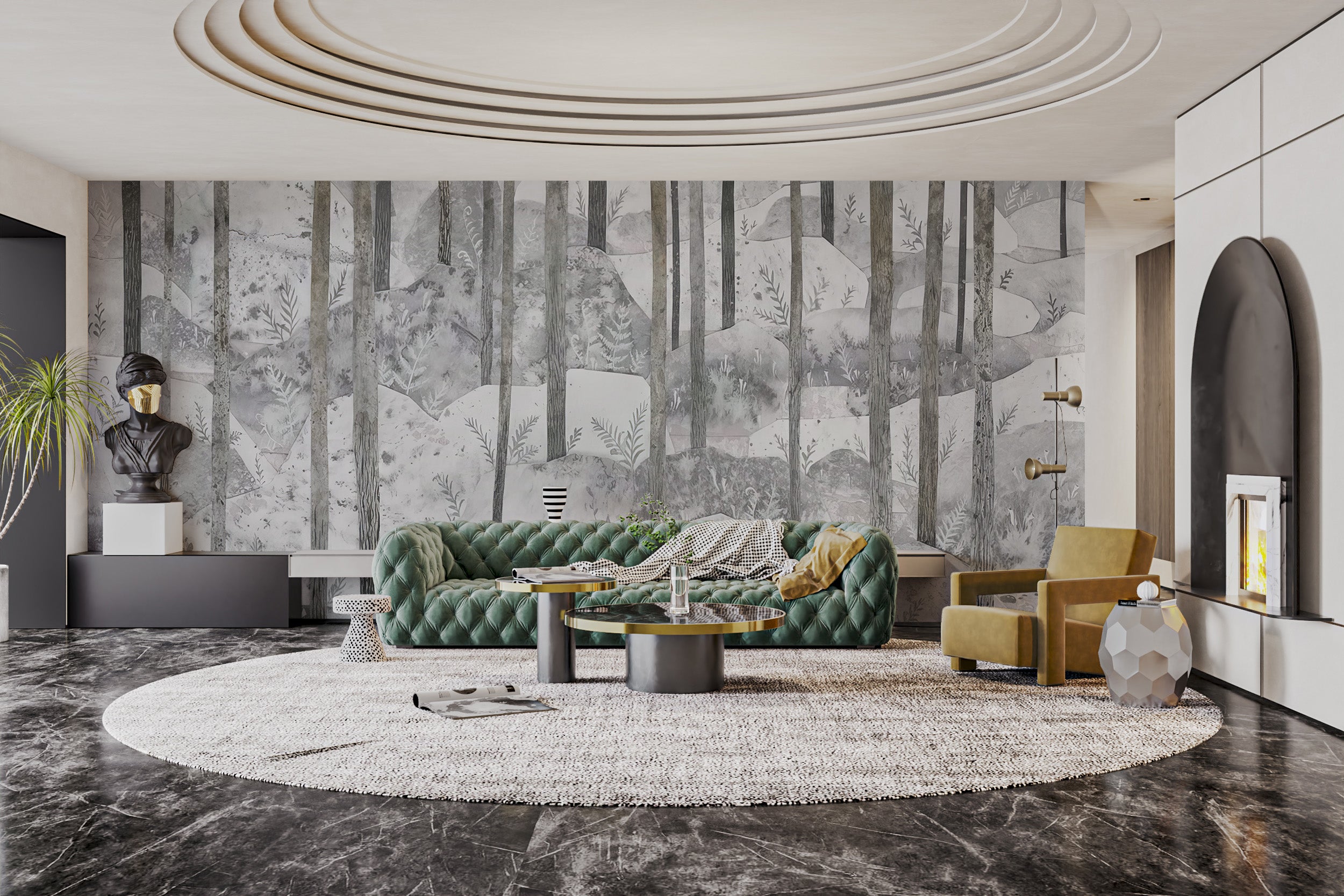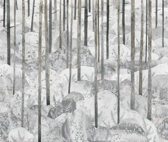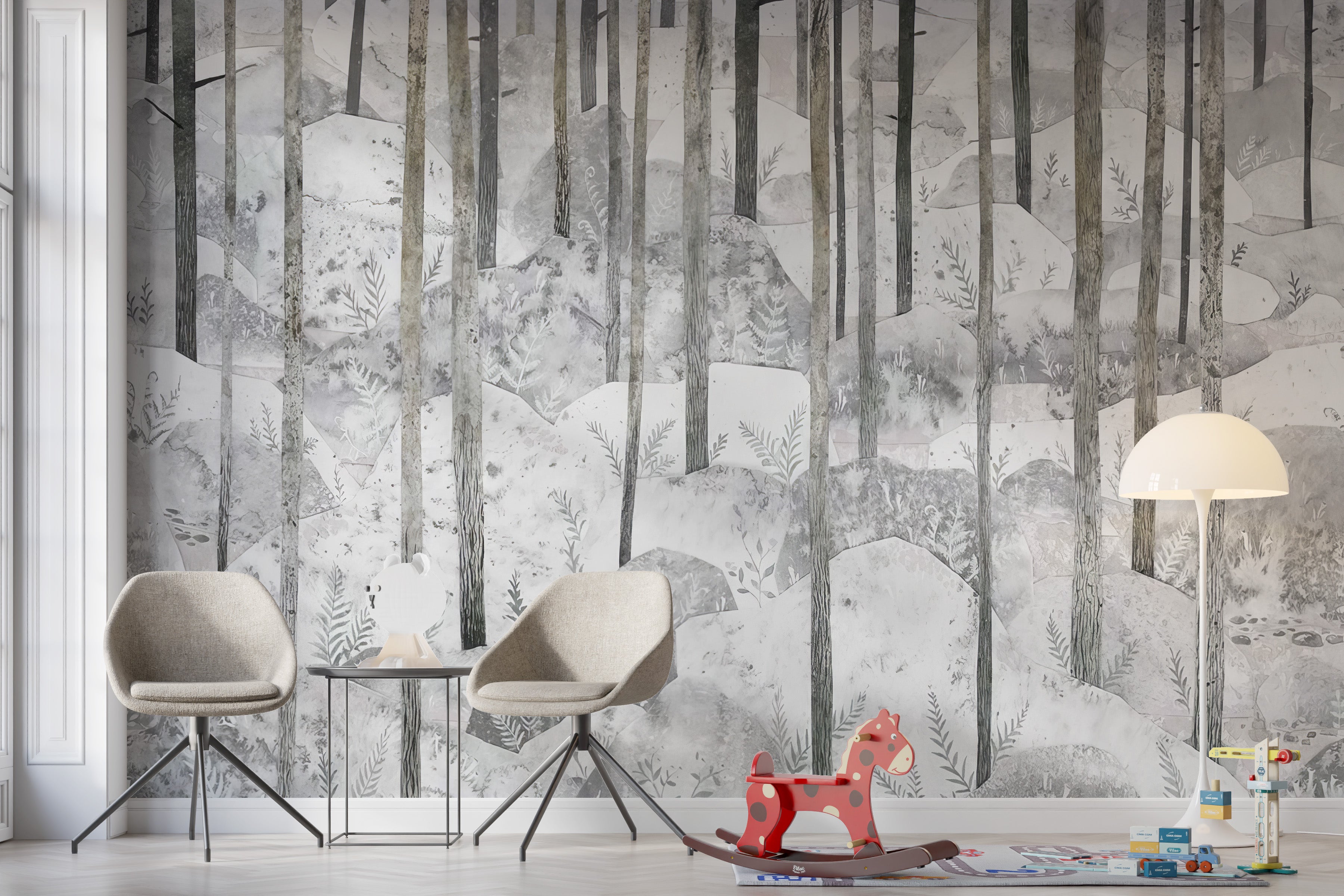 Drift into a world where the whispers of the wilderness grace your walls with the frosty fern forest mural. This expanse of forest wallpaper invites a delicate dance between shadow and light, as frosted ferns and silent birches interlace in a serene monochrome ballet. With each glance, you wander further into the depths of a winter-kissed woodland, a masterpiece that brings nature's quiet majesty to the heart of your haven. The nuanced greys and whites bloom on your walls, creating a haven where flora and fantasy meet. Delight in the subtle intricacy of this forest tapestry, where nature's artistry is celebrated in a mural that speaks in hushed tones of the forest's own poetry.