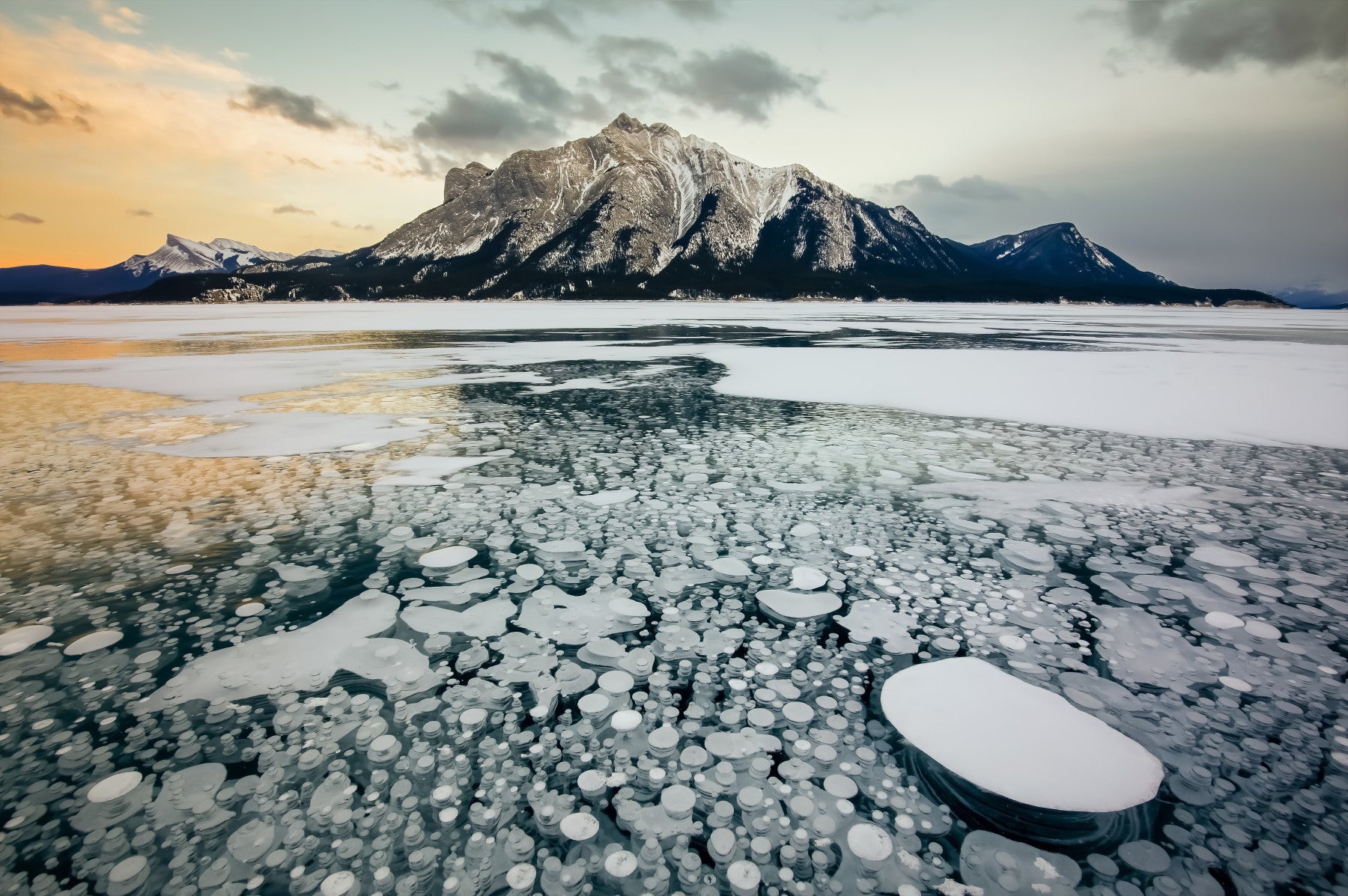 Witness nature's spectacle with this frozen lake wallpaper. The methane bubbles, trapped beneath the ice, create a fascinating pattern against the backdrop of snow-capped mountains. Hues of blue, white, and gold merge in a serene vista. The crisp, cool tones bring a breath of fresh air to any room. Use this wallpaper for walls in your living room or office and let the unique design elevate your interiors. This wallpaper offers a calming touch to busy spaces.